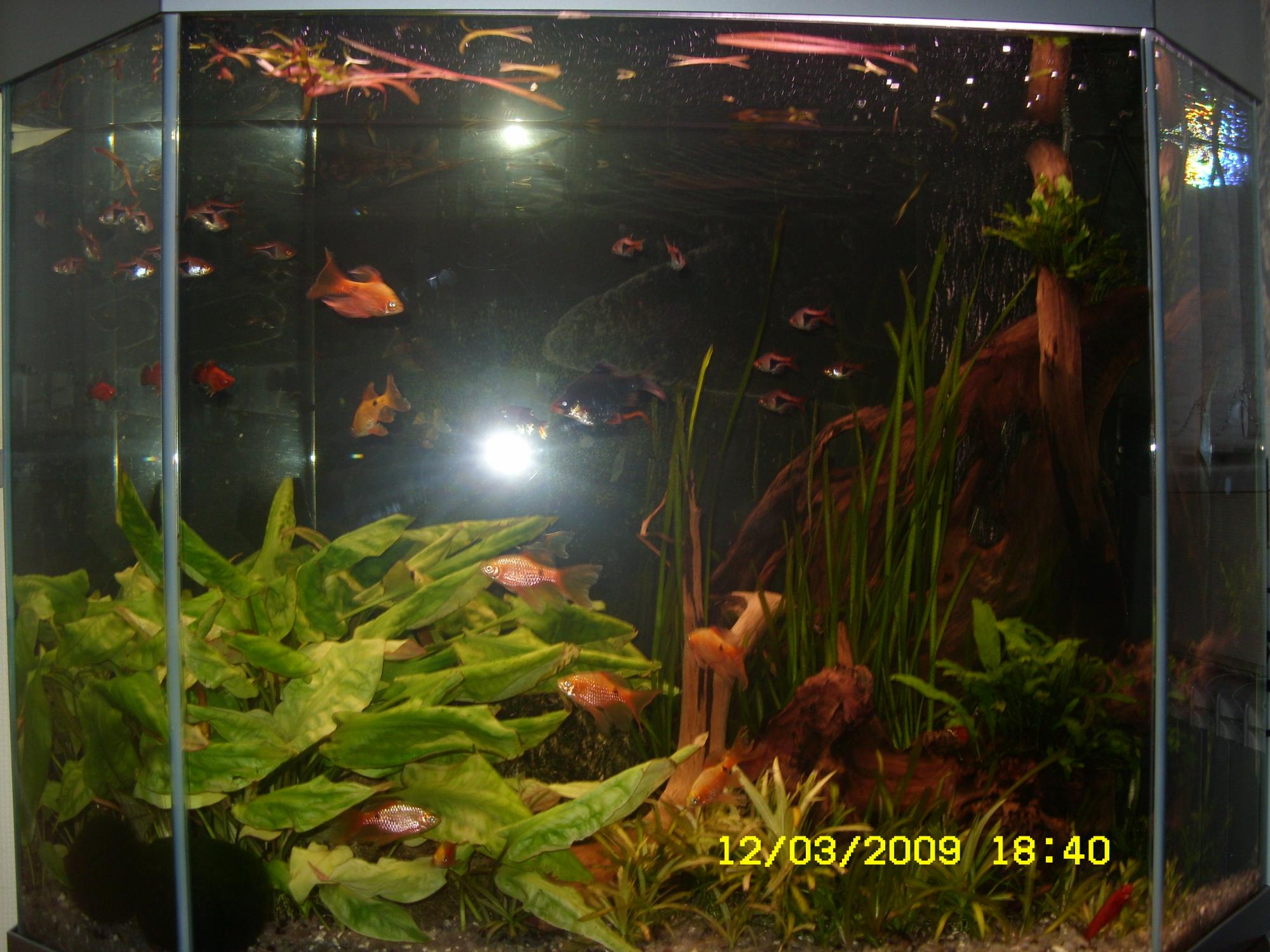 Насчитал 5 видов растений... валиснерия, эх нежный, стрелолист, она же сагитария, тайландский папоротник и криптокарина понтедериеволистная. Судя по фото - света очень мало... Рыбы многовато - фильтрация нужна достаточно сильная для такого колличества рыбы.
