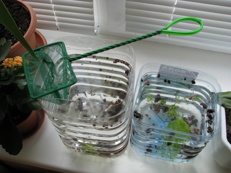 На данный момент это выглядит как 6-ти литровые баклажки с отрезанными верхушками, там литра 4 воды налито, ползают катухи, кидаю туда пока остатки дешевых кормов (завалялись), прикармливаю кусочками замороженных кабачков (кубики 5*5мм) вроде топчут неплохо, морковку пробовал давать - похуже трескают. Аэрации нет. Освещение - стоят на подоконнике. Думаю кинуть туда по кусочку какойнибудь растючки типа лимнофилы или роголистника.