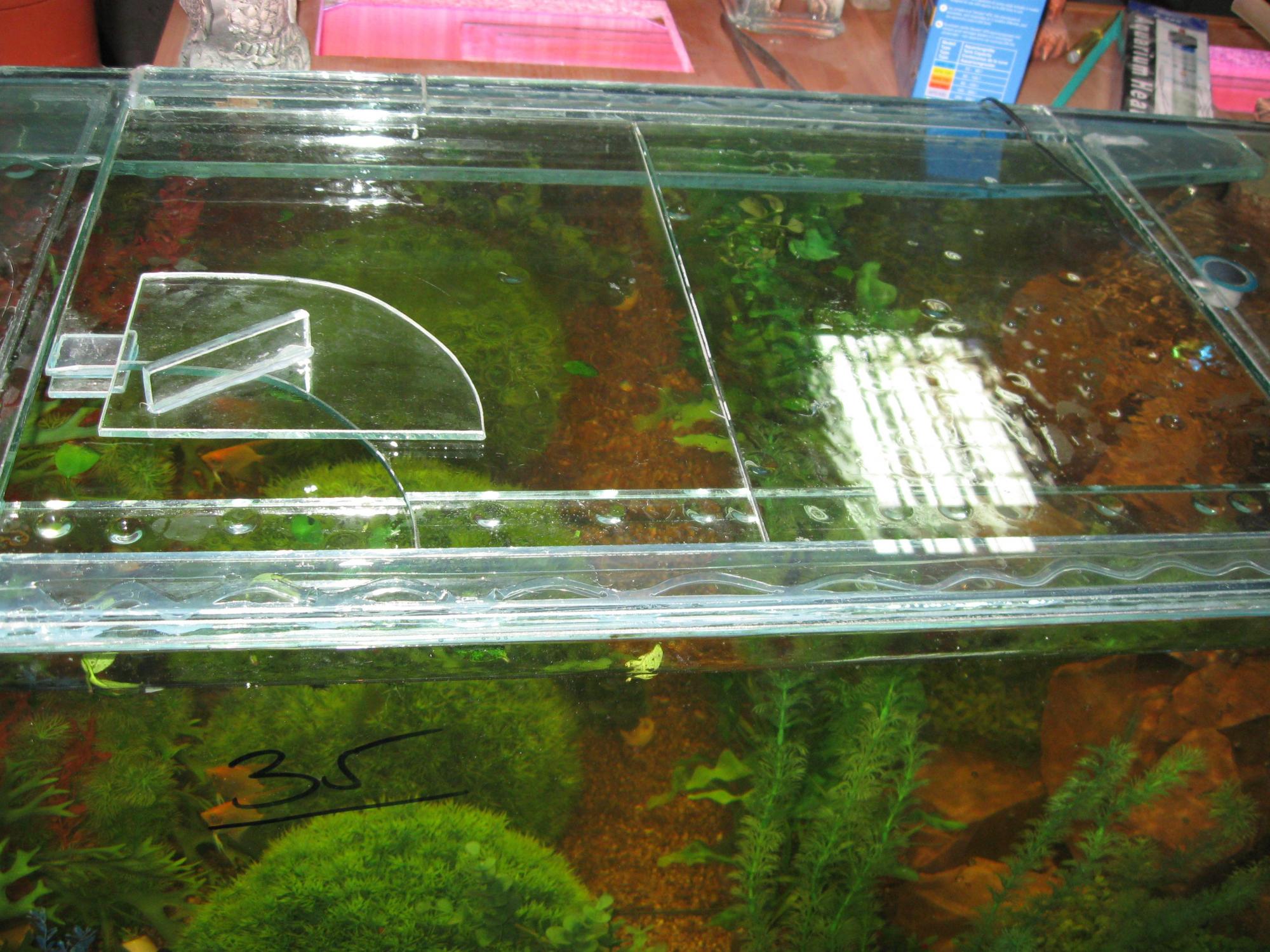 В аквариуме есть покровное стекло, что не дает воде испаряться, а рыбе выпрыгивать,установлено двойное дно для большей надежности.