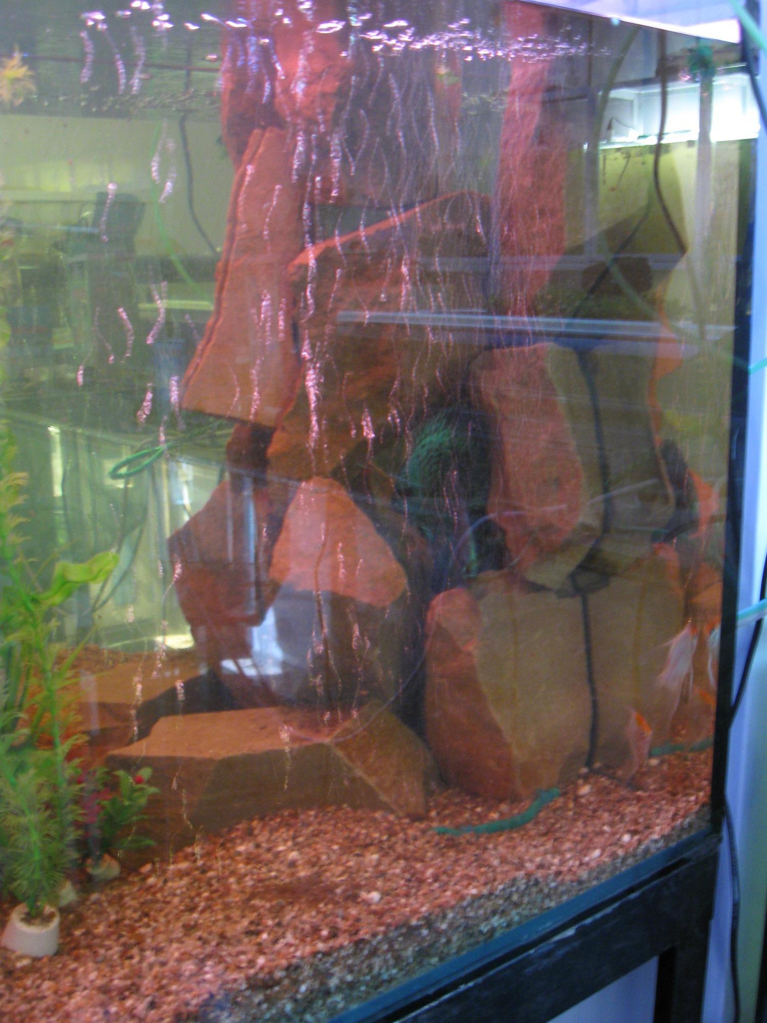 На задней стенке аквариума по углам установлен натуральный камень, за которым прячутся трубки фильтра, обогревателя, компресора и другое оборудование. Задумка камня такая, что вы видите в аквариуме всю природу и никакой технической стороны (проводов, трубок).