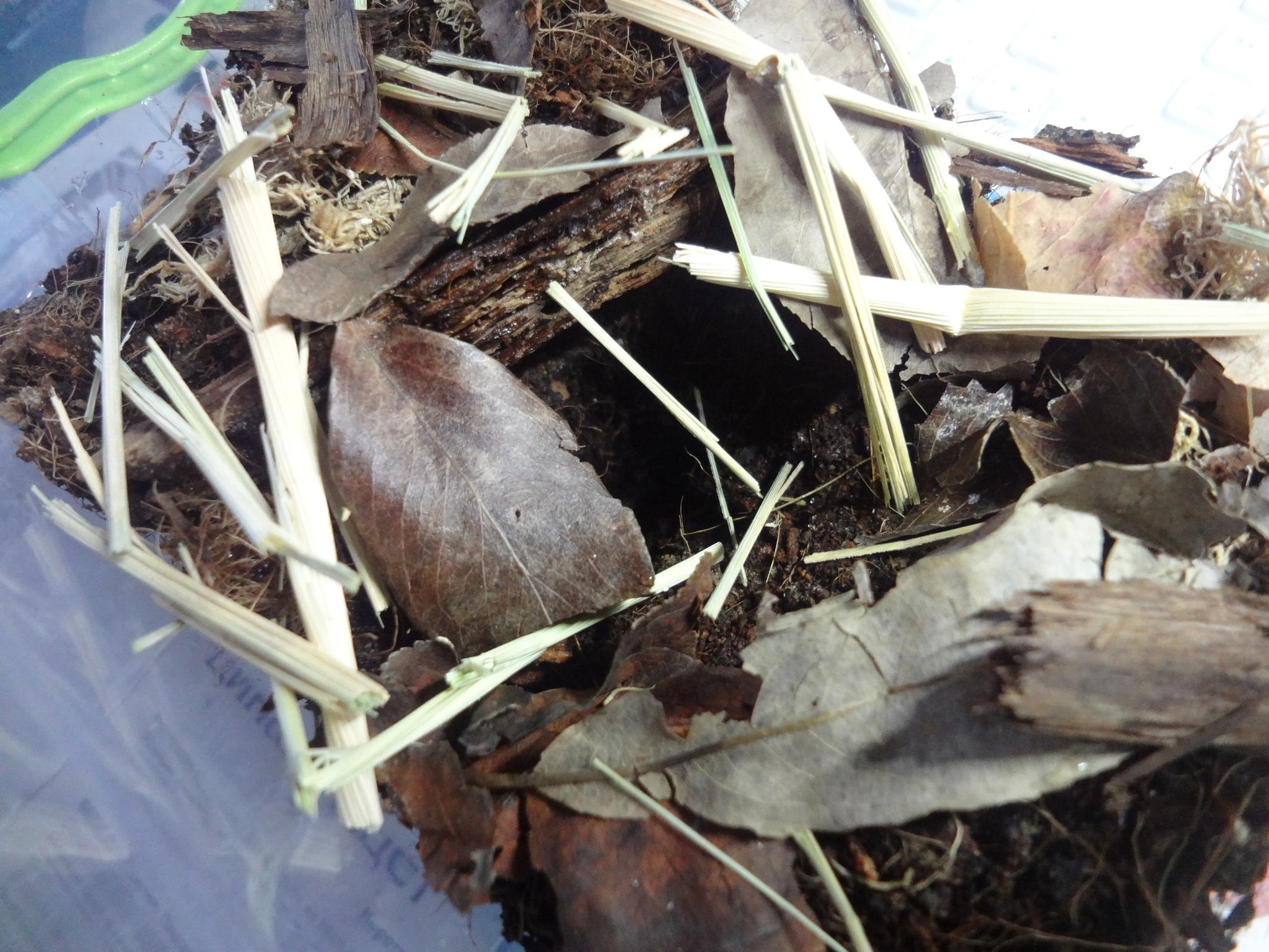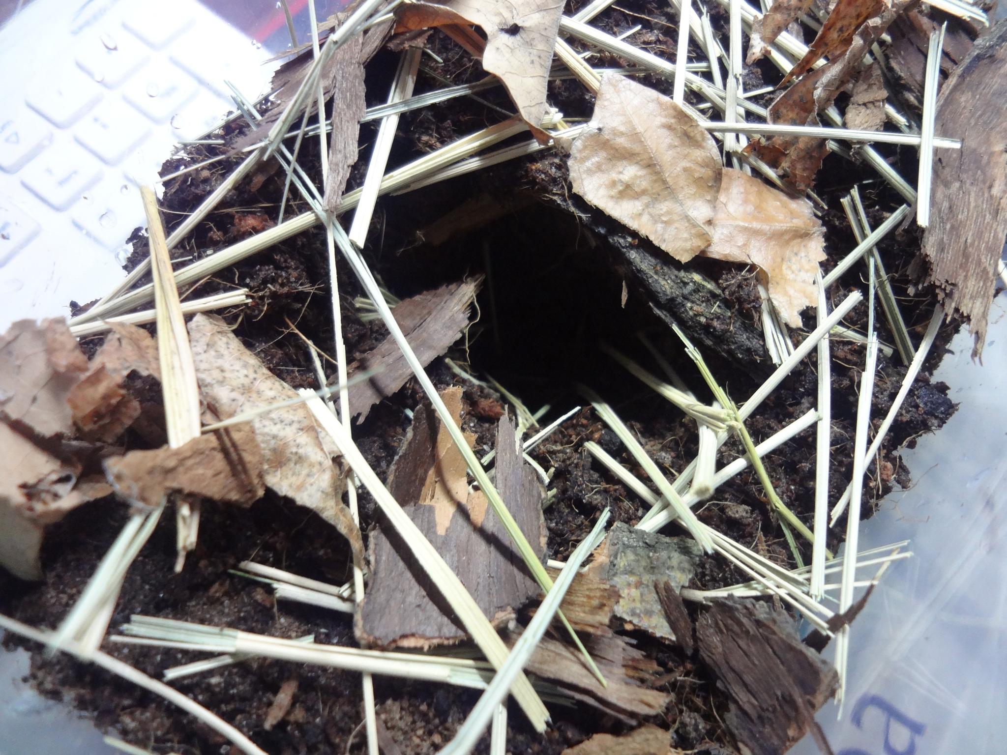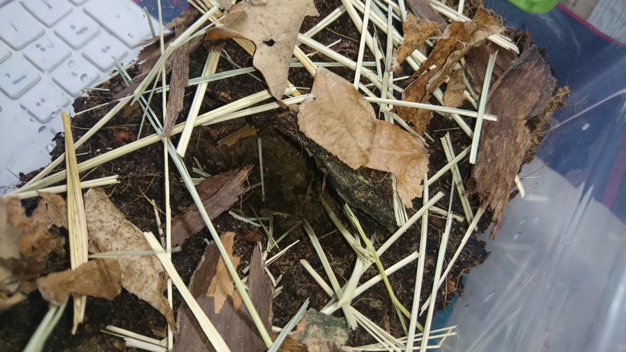 Спустя почти год дополняю тему фотками обустройства нор. Изначально, не все поняли, зачем на поверхности я оставил столько палочек, веточек, сухой травы, листьев и прочего "мусора". Так вот, как я и предполагал пауки очень охотно использовали этот "мусор" как строительный. Они весьма умело вплетали его по периметру норы, причём даже вглубь, тем самым укрепляя стенки. Как можно видеть на фото, вход\выход из норы возвышается от общего верхнего пласта субстрата примерно на 3-5 см. За счёт такого вот "строительного мусора" получилось всё довольно прочно, да и смотрится весьма гармонично, почти как в природе.