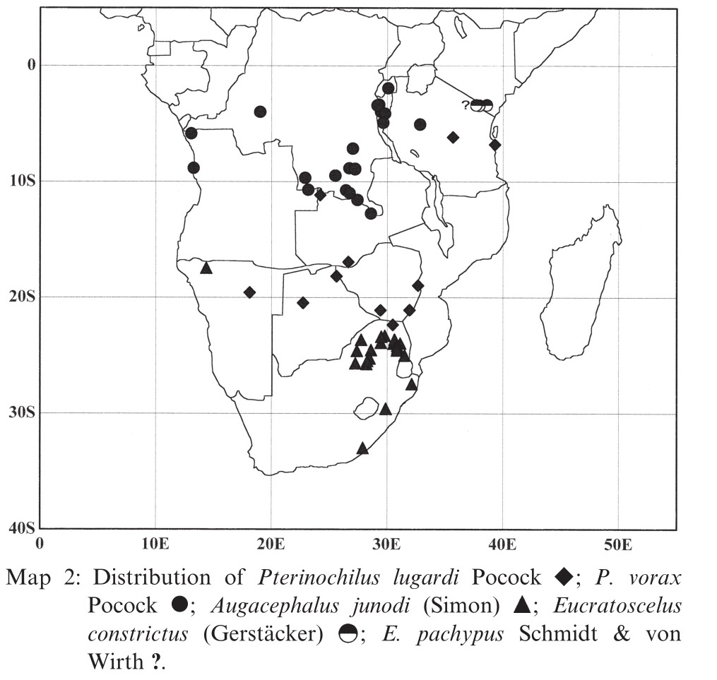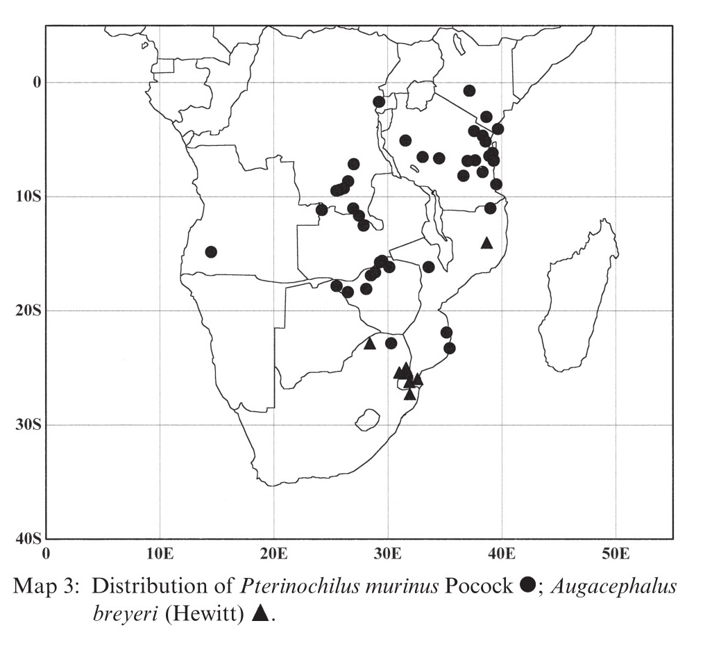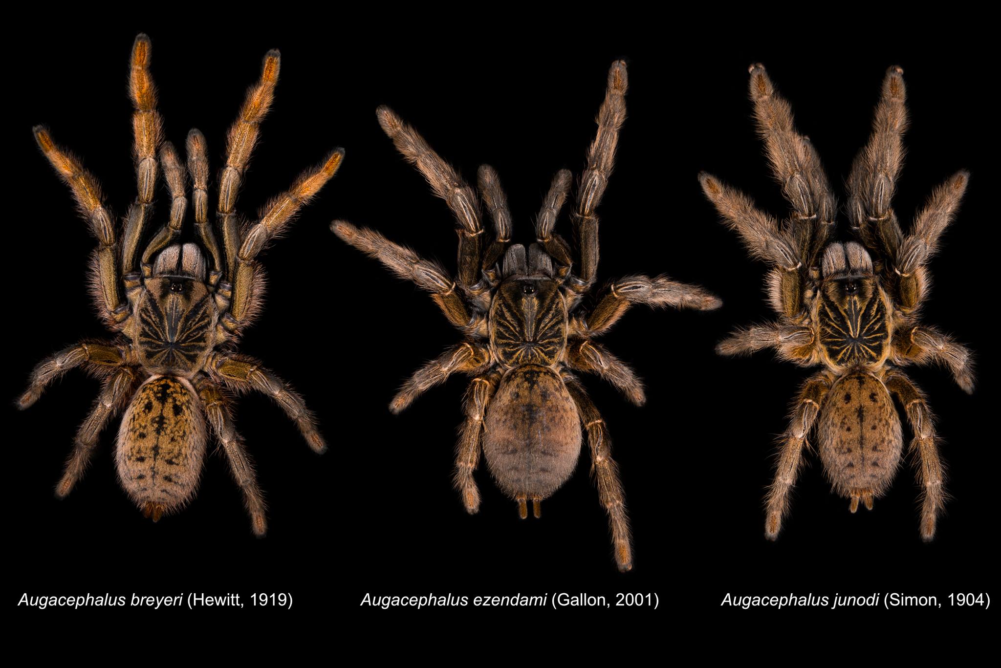 Augacephalus ezendami (Gallon, 2001) - самый мелкий представитель рода, взрослые самки вырастают до 11-12 см в размахе лап. Самки и самцы не сильно разнятся размерами по телу. Населяет юго-запад Мозамбика, провинция Газа, национальный парк Лимпопо (фото 5). Вид проживает на одной территории с Ceratogyrus darlingi. Очень часто бывает так, что норы двух этих видов находятся в 3-5 метрах друг от друга. Климатические условия более мягкие, по сравнению с A. breyeri и A. junodi. В зимний период ночью температура редко опускается ниже 12-13 градусов, а днем воздух прогревается до 26-27 градусов. Осадков зимой традиционно мало, 2-3 дождливых дня в месяц. Летом же температура даже ночью редко опускается ниже 24-25 градусов, а днем почти всегда не ниже 30, а то и больше градусов. В среднем, летом бывает порядка 20-23 дождливых дней в месяц. Этот вид наиболее массово распространен в хобби.