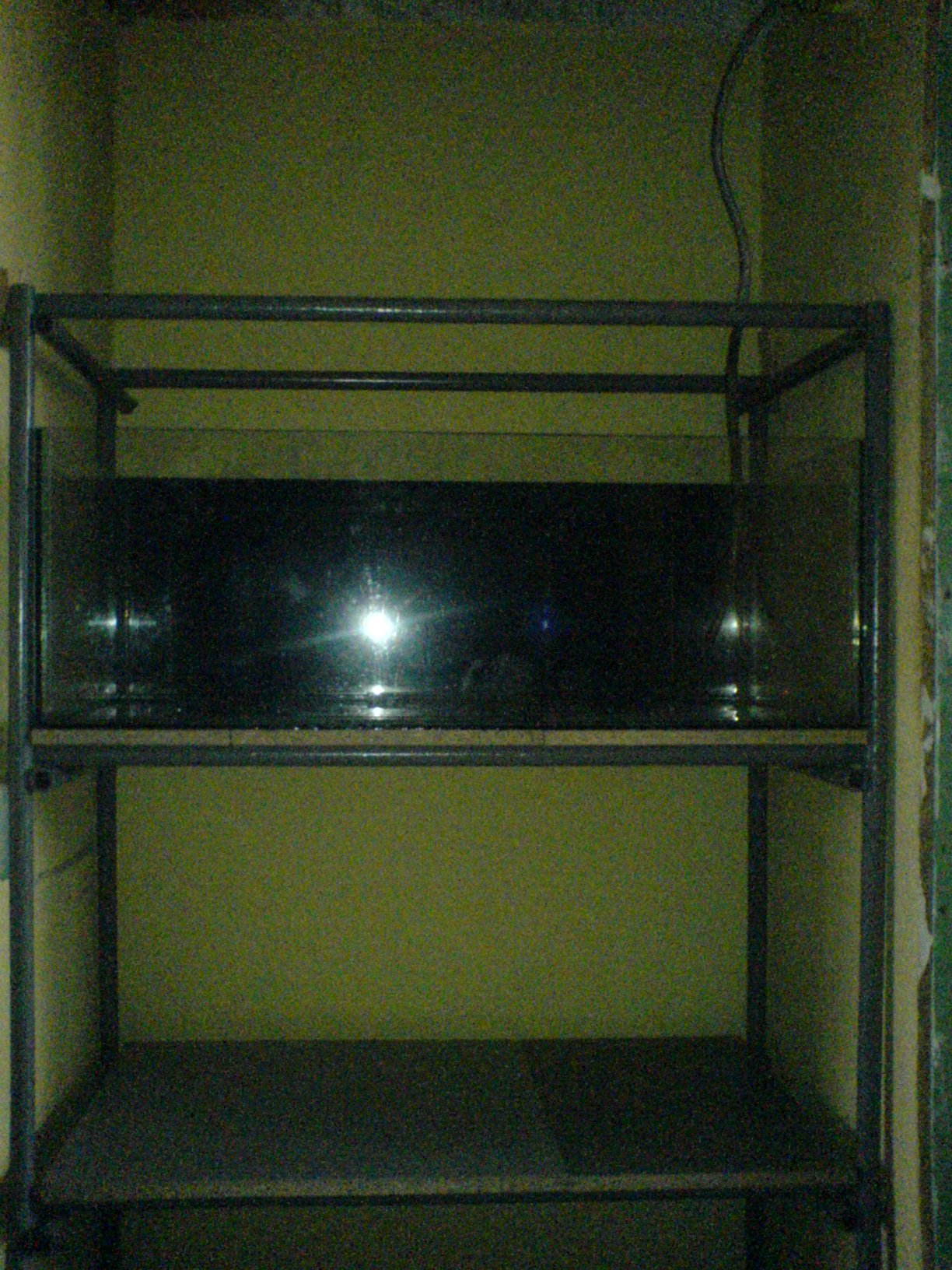 Стойка собрана из старых труб отопления на болтах 8мм. Выставлена при помощи металлических пластин-подложек. Полки из обрези ДСП, в качестве отражателей обрезь зеркал (приклеены на силикон), сами аквариумы из Б/У витрин ( 6мм ). Излишне объяснять, что эти материалы безценны