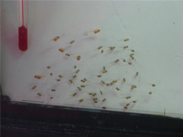 Доброго дня,форумчане. От нерестились (случайно) золотая жемчужина и зеленая скалярии. Малек два дня как поплыл. Родителям 10-11 месяцев. Вопрос к форуму: "что получится?"