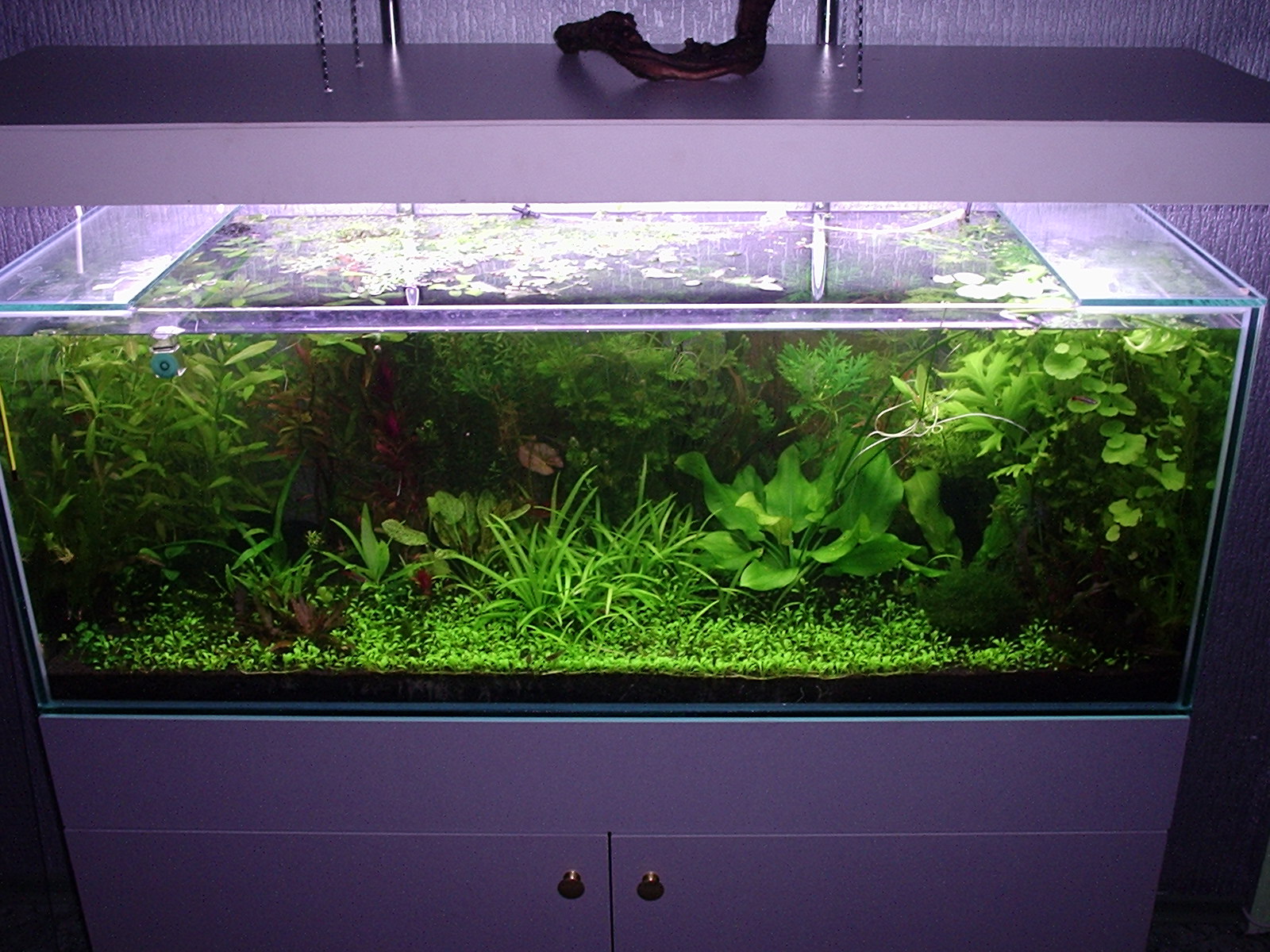 Аквариум из начально делался для жены,но так он в дальнейшем не вызвал особенного интереса все обслуживание лягло на мои плечи))) http://aquaforum.kiev.ua/showthread.php?t=40523 .Так как запуск первого своего травника происходил далеко не гладко и часто появлялось желание спустить все в  то в этом случае я до сих пор приятно удивлен.Аквариуму всего 3 недели.Рост растений отличный.В первом травнике с чистым осмосом,светом более ват на литр,С УДО и СО2 такие растения как Ротала Валихта,Амания,Незея..словили глубокий радикулит то после пересадки в новь запущеный аквас все отошло и нормально пошло в рост.Вода-водопровод,свет 0.5 вт/л,..УДО,СО2 6-7пз/сек все сразу.Была вспышка бороды на 7 дне.Подавил трех дневнным применение Сайдекса 10 мг/л.Эхинодорус крапчатый выпустил 2 стрелы,Альтернатера рейнака очень радует своим ростом как и многие другие растения.Одним словом легкий запуск.