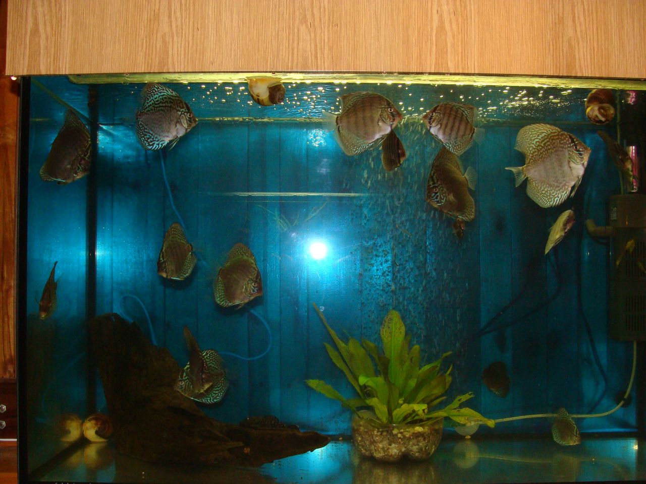 Представляю вашій увазі свою скромну господарку. Створювалася на протязі 10 років. На фото присутні-450 літрів, під ним 4 нерестовика на 25л., дискусятник на 350л., 250л. з астронатусами, 200л.-барбусятник, під ним-виростник на 100л., ще один виростник на 150л., і 50 л. під ним, а також виростник на 120л. Всі кришки, а також стійки під акваріуми виготовлялися власноруч.