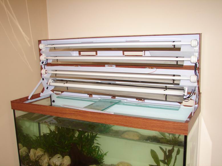 Вопервых - сделал новую крышку. Старая була неудачная, верхние панели постоянно прогибались. 2*54Вт света было маловато под новые задумки... Вобщем сделал новую - три линии света - 38Вт гролюкс, 54Вт аквастар и 2*54Вт гролюкс. Плюс ко всему этому - "луна" - три группы синих светодиодов по 3 штуки. Забегая вперед - неудачные балласты с кардач - сгорели оба в течении первых суток эксплуатации. Наконец то установил отражатели, которые сделал года два назад ;-)