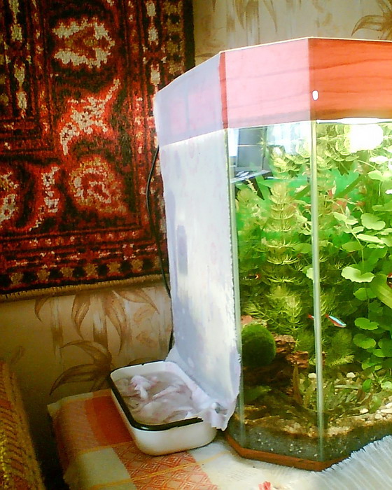 Берете х/б ткань по ширине одной из выбранных Вами стенок аквариума. Длина ее должна соответствовать высоте аквы + 20-30см. Вполне подойдет старая простыня или, еще лучше марля в несколько слоев. Намачиваете ее, слегка отжимаете и плотно и равномерно прижимаете к стеклу. Нижнюю часть ткани опускаете в какую- нибудь емкость с водой