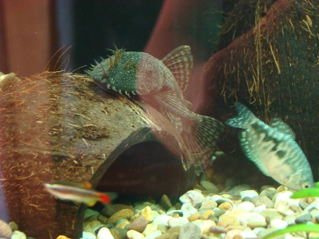 Первая фото, где он лежит в пустом аквариуме, была снята ровно год назад. Сейчас его размер около 10 см. Если еще найду среди своих фото - выложу.