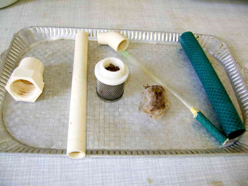 В сетку засыпается песок, накручивается переходник, в него укладывается синтепон На фото, синтепон, простоявший в фильтре неделю), затем устанавливается трубка нужной высоты, надевается шланг и надевается колено с заранее установленным в нем распылителем. Распылитель должен быть установлен чем пониже, 1 см от синтепона.