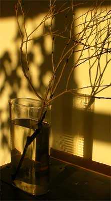 Поставленная ветка через некоторое время должна выпустить водные корни. Продолжительность этого стартового времени зависит от времени года: если ветка срезана зимой - сначала она выпустит листья, и только после их развертывания иве потребуется дополнительное питание и она озаботится корнями. Весной-летом ветка уже с листьями и появление корней происходит через 2-4 дня. Осенью, наверное, ветка сначала сбросит старые листья и выдержит некий период покоя.