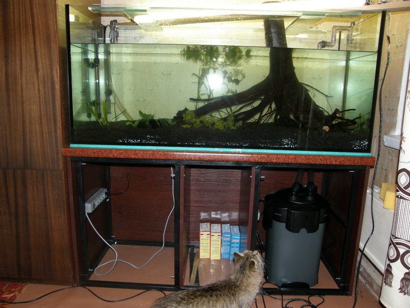 Привез корягу, вымыл ее в ванной под наблюдением кошки Масяньки. Установил. Вода потемнела до «чайной» ( http://aquaforum.kiev.ua/showthread.php?t=42493), но я это знал – меня не напрягает, наоборот, вода как в Амазонке.