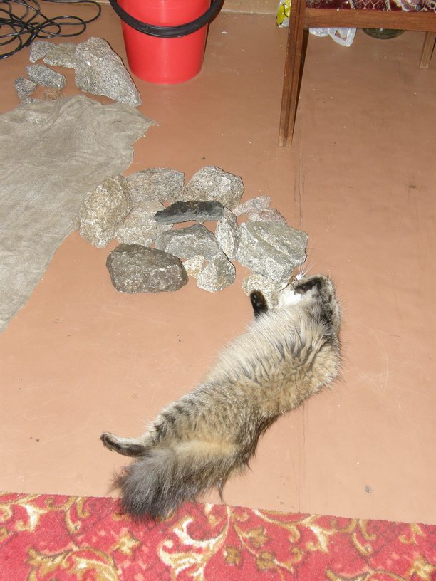 Съездил на плотину (40мин от дома) и набрал 2-3 ведра камней. Вы пробовали на велосипеде везти в корзинке и рюкзаке ведра камней? Нет? Лучше и не пробуйте! Просто поверте на слово. Лучше выкопайте еще один пень-коряжку! =) Носите-возите по 2-3шт. Не знаю как рыбы, но Маська камням очень обрадовалась. Далее я сильно тупонул и положил камни без проверки уксусом, но думаю все будет ОК, т.к. они все типа гранита.