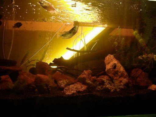 Отловил остатки рыбы из маленькой аквы (два дня ушло, т.к. никак не мог поймать одного анцитруса и двух неизвестных мне полосатых хитрожопов, которые спрятались и устроили мне инсцинировку "Защита замка"; может, кто подскажет их название?) и пересадил всех в большую. Забрал у друга брата еще несколько взрослых рыб. Все плавают и радуются жизни. Вода прозрачная, неприятного запаха нет.
