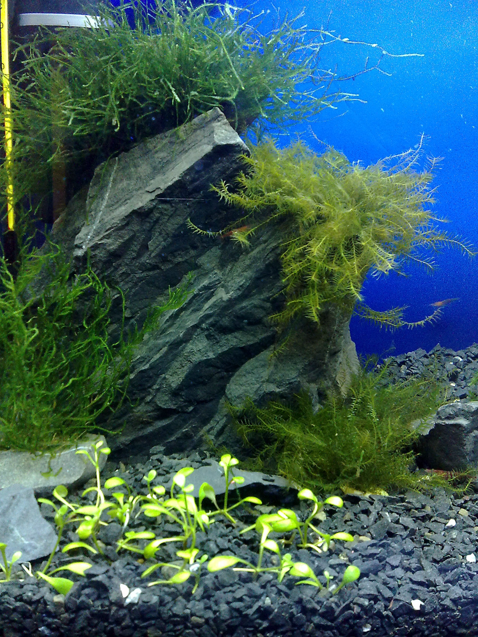 В общем запуск проводился как всегда: поставил камни, засыпал грунт, залил воду. В течении 2-3 недель были приобретены мхи и запущены первые жители. Свет начал включать по 6часов сначала, сейчас горит по 7-8ч. Вспышек водорослей не было. Мхи немного пошли в рост.