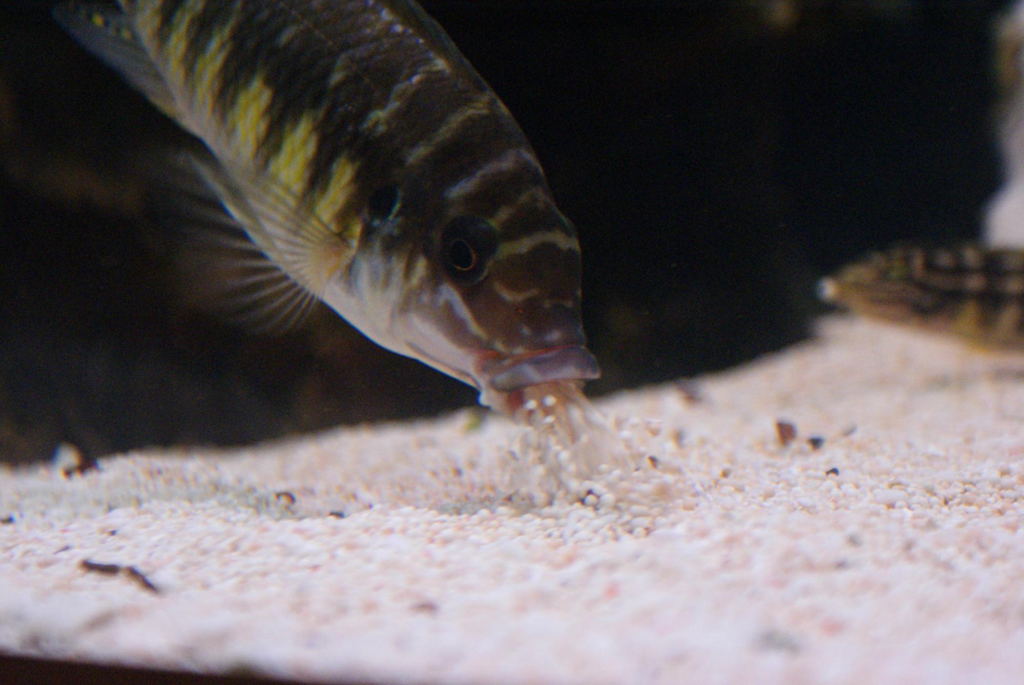 Артемия, дафния и т.д., абсолютно противопоказана для травоядных Танганьикских цихлид. Довелось правда встречать когда троф кормили даже трубочником, и некоторые из них по счастливой случайности выживали, правда это были плохо окрашенные особи с нездоровым внешним видом, и это преступление... С первых дней лучше всего соглашусь с Vutty правильно поднимать молодь циклопом, где то через месяц добавляю в рацион спирулину 36% к ней 10-15% тетрамина (то есть смесь 90% спирулина на 10% тетрамина), но это не обязательно, мне кажется, что находящийся в тетрамине каратин естественно предает рыбе более яркую окраску. Если внимательно изучить манеру питания в природе скажем трофеусов, то мы найдем там, что они не только соскабливают с камней наросты зеленых водорослей в которых попадаются различные животные микроорганизмы, но и набирают в рот песок отфильтровывая мельчайших обитателей проживающие в нем. Но с тетрамином надо быть аккуратным, и не в коем случае не увеличивать пропорцию. Раньше, когда еще не было сбалансированных сухих кормов, я кормил трофеусов приваренной крапивой, лопухом и тыквой, ошпаренным салатом, шпинатом и т.д. и всегда циклопом...