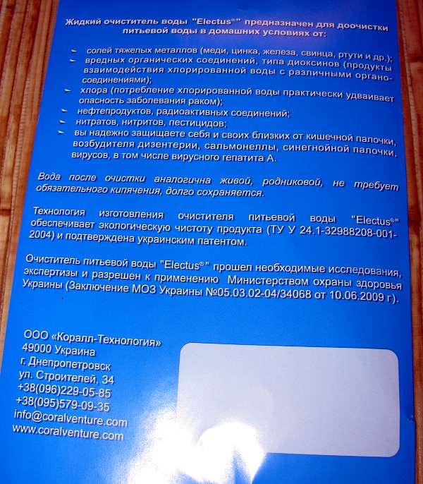 Re: Коагулянт Electus. Днепропетровск. Кто желает потестировать????? ===www.aquaforum.ua===