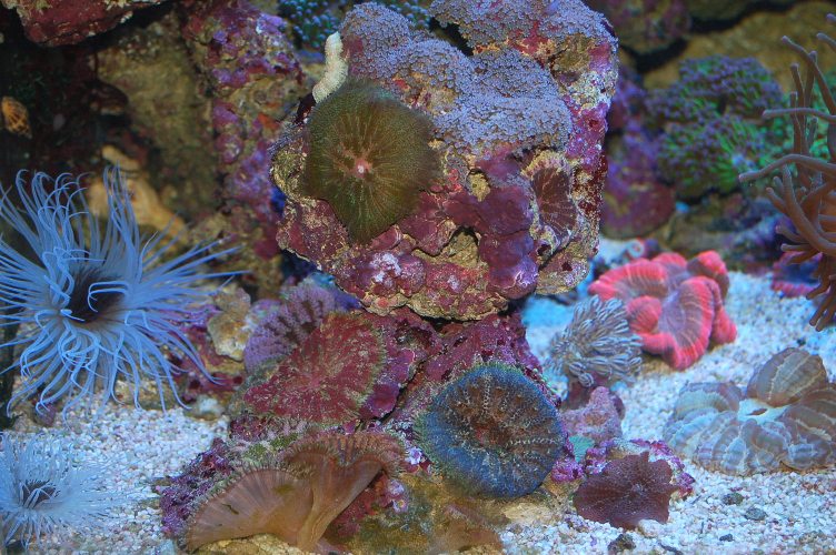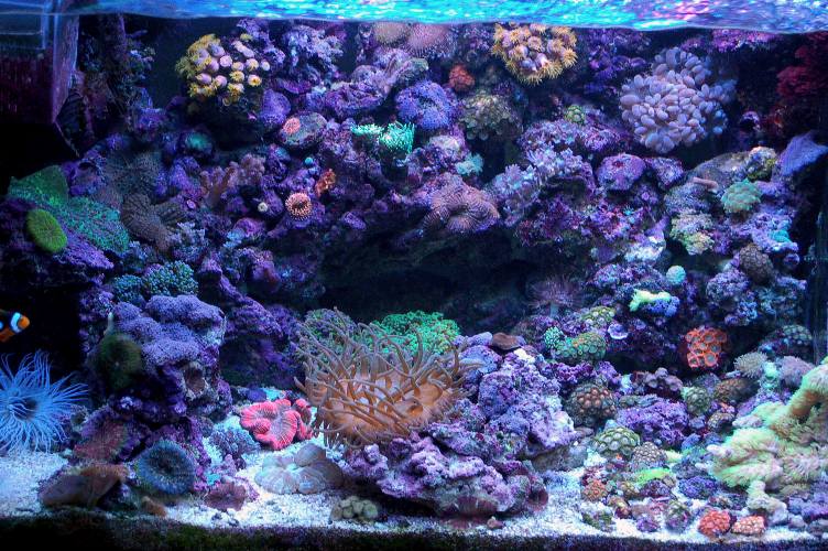 Из рыбы сейчас только пара оцеллярисов, большой камень с актинией нездешний, пришлось поставить недавно в связи с перезапуском другого аквариума, отобрал у кларки. Оцеллярисы же эти совершенно не интересуются ни актиниями, ни сарками или эуфиллиями, чистят регулярно круглый булыжник, который им поставил, но пока не метали.