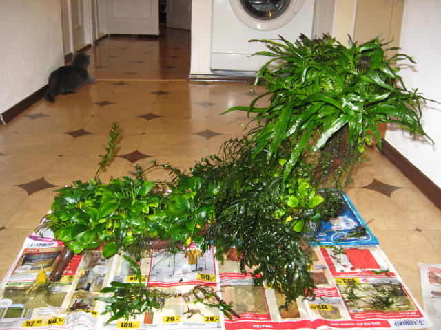 Потом, недели две, вымачивал в воде - боялся, что будет подсаливать воду. В аквариуме сразу утонула, воду не подкрашивала, но в течении месяца вся покрылась "белым пухом", как потом выяснил детритом, который, в свою очередь, с удовольствием слизали анциструсы. В течении старения, на ветке, наблюдал появление каких-то маленьких черных узелков, изменение цвета, но беспокойства у жителей аквариума, вроде как, не замечал. В начале пробовал затемнить ее немного марганцовкой, но скажу сразу - нет смысла (в воде со временем потемнеет, а сейчас и не видно какого она цвета  ). Привязал сразу пяток кустиков анубиаса, попозже больбитис и папаротник. Переодически подрезал и направлял. Все растишки чувствуют себя отлично (на фото немного желтит, но это моя некомпетентность в фотографии), только папоротник "попер к Солнцу", обпалил верхние листы и начал расти вширь да в глубь, образовав "Шапку Маномаха" в верхней части. Переодически туда течением заносит всякую мелочевку (мхи, ричия, пистия) и на поверхности образуется "остров сокровищ", аквариумеые растения переходят в плюдариумную форму - красиво смотрится, но аквариум закрыт крышкой (кроме меня никому такую красоту не видать). Первое фото лето 2008, а последующие - вчера (пербирал аквариум, не сообразил сфотографировать на месте, после уборки устаканится - выложу фото). Еще раз оговорюсь, фотограф я посредственный и не смог передать насыщенный зеленый, не судите строго