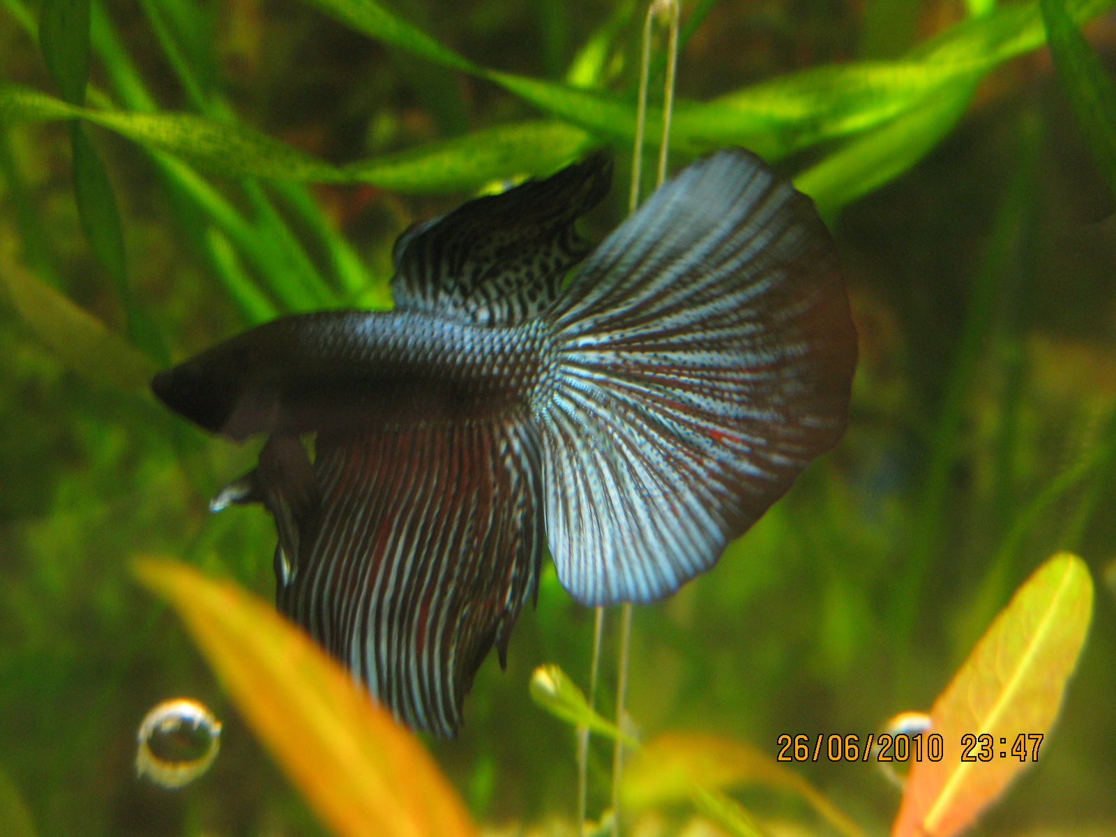 Потом мы все вместе очень долго лечились: от бактериалки, от плавниковой гнили, от колумнариса, от гексомитоза (ещё не закончили), от глистов - от них умерла синяя кроунтейл-пересорт. Она пришла какая-то истощённо-рахитичная, я думала -затянутая (предыдущий пост, фото 3). Потом её резко начало раздувать - я думала, бактериалка, но лечение не помогло, а после смерти показался гельминт. Пришлось всю чесную компанию подвергнуть терапии. Но вобщем, на сегодня мы такие: (ещё одна самочка умерла по моей вине, она, уже здоровая, выпрыгнула из аквы  ).