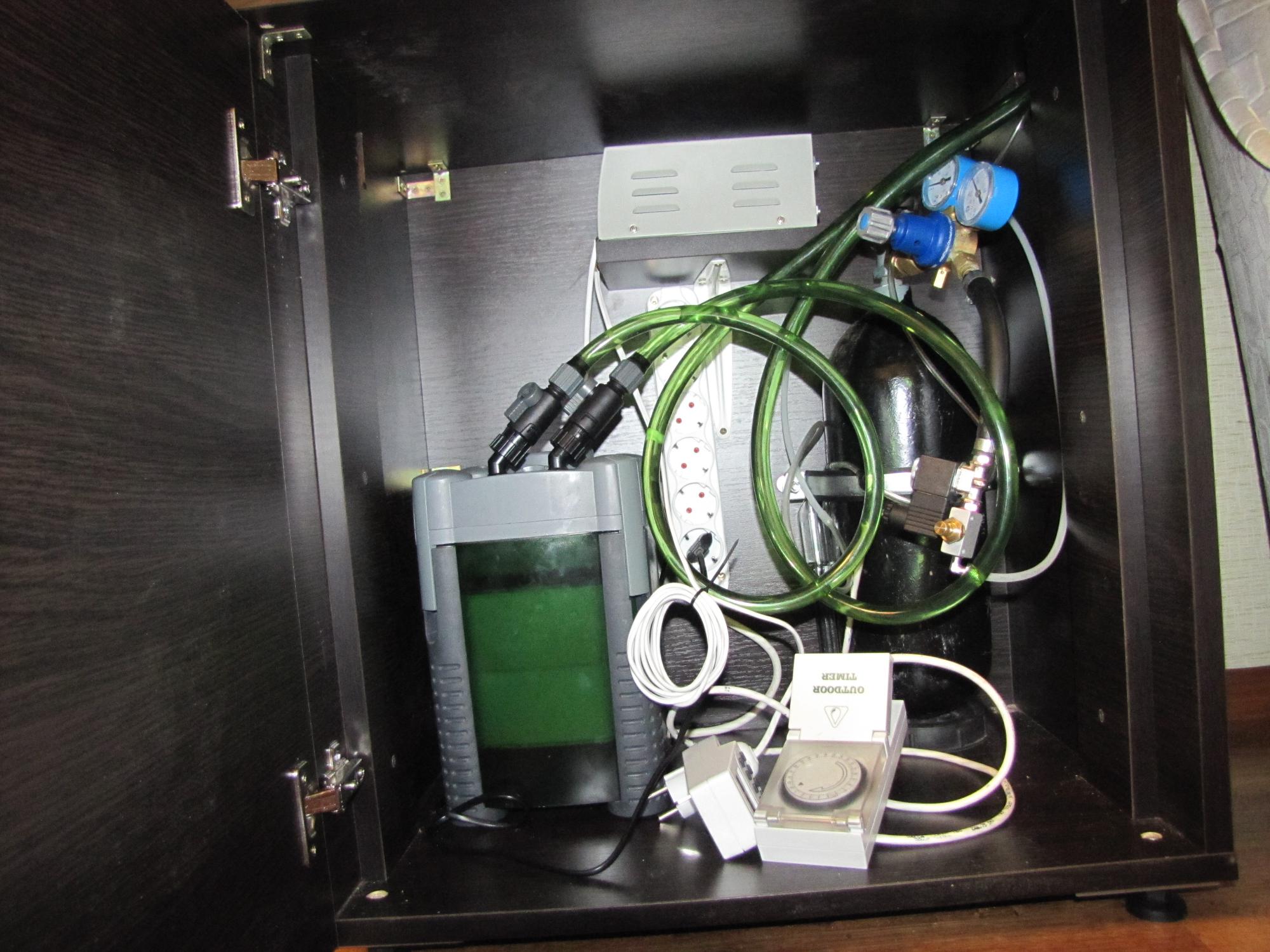 Штанга-стойка, на которой светильник висит, сделана из труб нержавеющих с матовой поверхностью (не люблю блестяшки) двух размеров 14х1.5 и 18х1.5. На токарном станке были сняты фаски, красиво посверлили отверстия, нарезали резьбу под штифты. Одна труба основная, которая крепится к тумбе, вторая, которая гнутая вставляется в первую. Гнул на работе (работаю на заводе) Расстояние между поверхностью воды и светильником регулируется раздвижением труб (надеюсь, ясно выразился) фиксируется двумя штифтами с резьбой. Из аквариумного оборудования есть фильтр Атман (купил б/у) внутри губки и синтипон. Баллон СО2, арматура камоци (все стандартно). Ну и моя гордость - стеклянные трубки))). И еще, веточка рябины)).