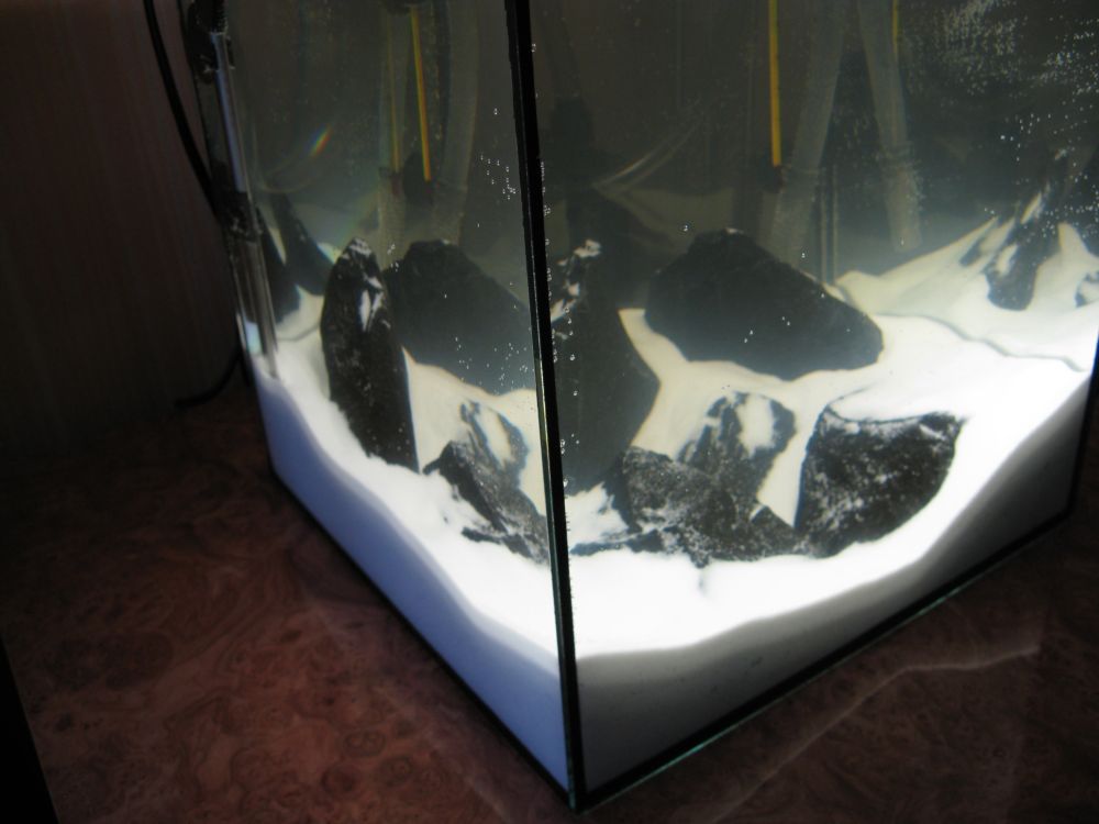 похоже на заснеженные Карпаты) Думаю посадить почвопокровку - куба сюда бы отлично подошла. Передние три камня отлично легли, а вот заднии два....Особенно, левый...слишком грубый....Вообщем, нужно поиграться с ними... Я представляю в акве что-то подобное горам покрытым снегом...кое-где проступает зелень...Фон бы сюда пошел голубой или вообще небо-облака...