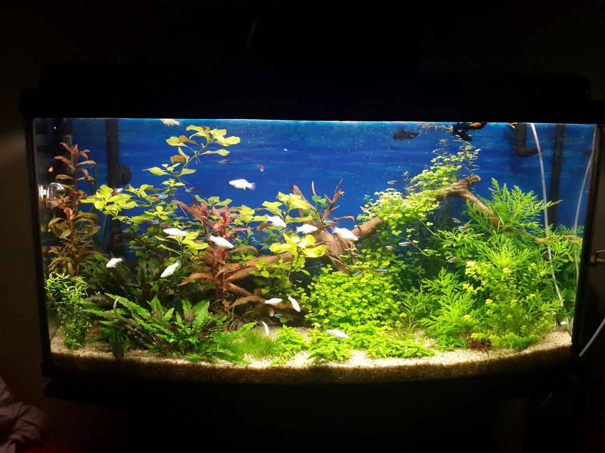 Акваріум - 200л, Грунт - кварц, СО2 - постійно, Світло - 10год (150ват), Фільтр - JBL e1501, Температура 25