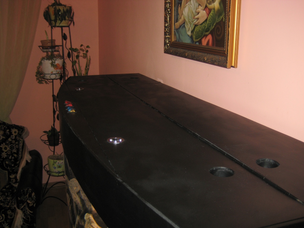потом поставил крышку на акву и измерял на акве до миллиметра + запас 5 мм( если б неделал запас то не влезла б крышка на акву).потом тот угол что шел на стык, обрезал его ножом под 30 градусов примерно чтоб площа стыка больше была и приклеил клеем без каких-то обробок просто помазал и прижал на минуту (благо клей очень хорош). Если спереди только одна часть наклеена то оно получается оч. хлипкой, поэтому я делал спереди на овале панельку, прикрепив еще ребрами. В итоге перед получился очень прочный и с панелькой вообще не прогнуть руками.