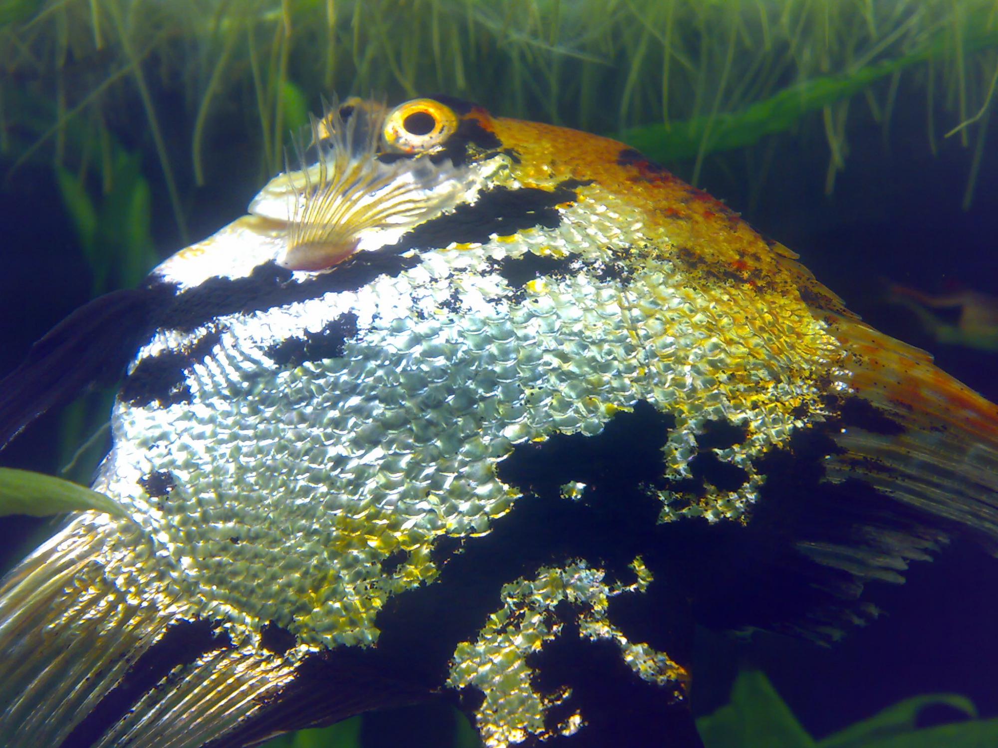 Самец скалярии уже как неделю находится в неестественном положении, под углом 45 градусов. Искривлен позвоночник. От корма не отказывается, никаких нарывов, язв не замечено, поведение стандартное. При этом находясь в таком положении, лезит к другим самцам "выяснять отношения", соответственно, все плавники обтрепаны, как будто хочет, чтоб его добили.