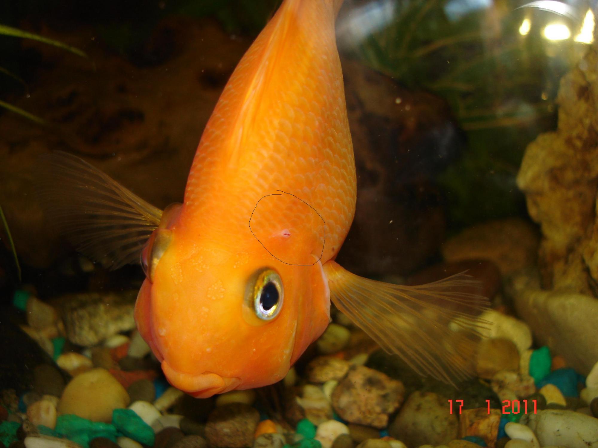 ест хорошо.кала как-то не замечал.плавники начали слоиться.ещё заметил у красного попугая что-то типо нароста белого цвета,размером чуть больше пшённого зерна,сразу за головой,и на хвостовом плавнике 2 белых пятна.самый кончик хвоста-расслоился.
