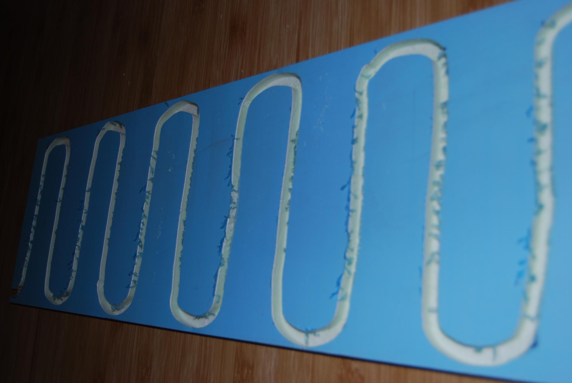Glock ,.на каждую полку выведен отдельный термошнур. размещён на задней стенке.он вложен в сендвич панель,которую используют для пластиковых дверей.(фото 1)её толщина 1 см,этого хватает чтобы утопить в ней шнур и поверхность к которой прижимаются теры была ровной.фрезой диаметром 1 см выбрал верхний слой пластика,зигзагоподобно, и пенопласт до нижнего пластика.(фото 2).шнур вложил в получившуюся канавку.для эстетичности на фрезерованую сторону наклеил декор плёнку,при помощи скотча,на случай если прийдётся поменять шнур.поставил эту приспособу к задней стенке полки и прижал терами.как по мне смотрится отлично.