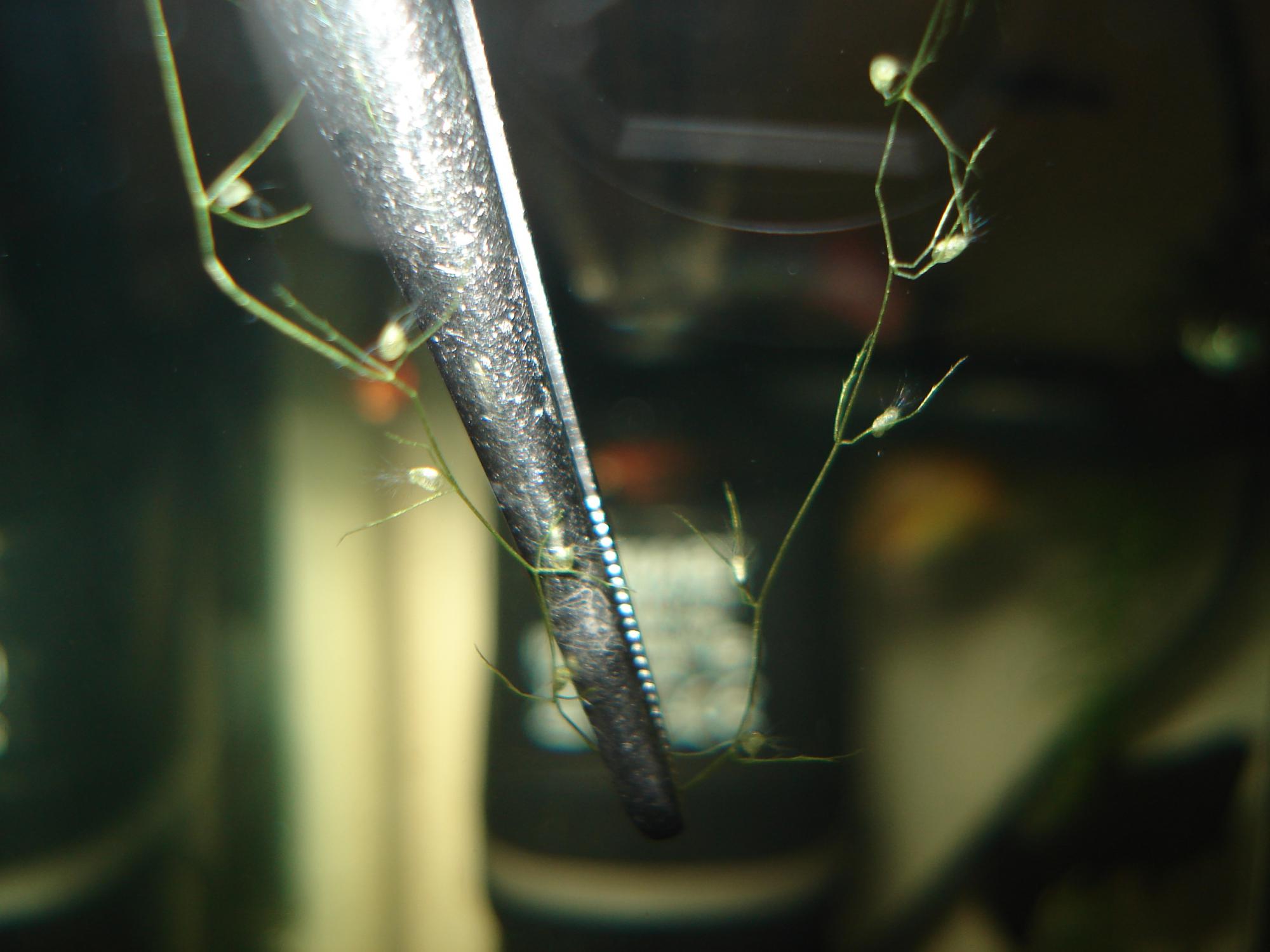 Стебель выглядит как тончайшая нитка диаметром примерно 0,1 мм. С шагом 8 мм на стебле есть мелкие листочки (пузырьки) диаметром примерно 0,5 мм.