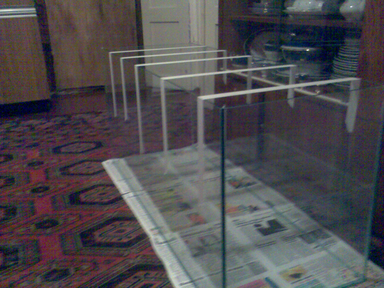 Загорелся желанием увеличить обьем своего водного мира, приобрел стекла №8 на аквас 1200*450*550,клей, малярный скотч и началась работа..., после чего начал изготавливать тумбу (уголок №40(изготовил квадратный профиль), ДСП от старого шкафа, шпон на кромки) и вот что из всего этого получилось: