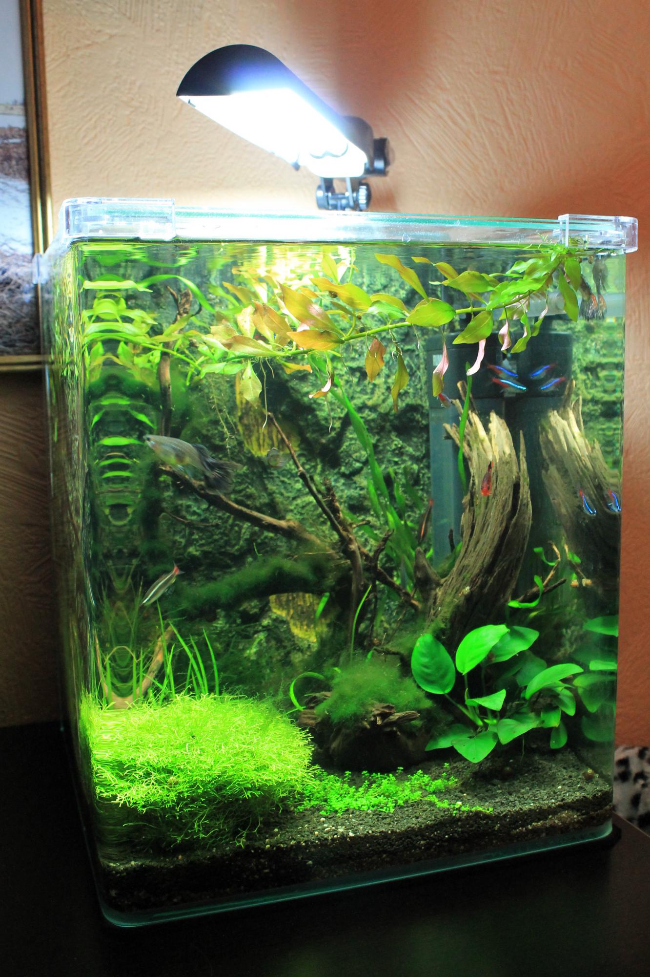 Всем Доброго времени суток и с Новым Годом!Выкладываю на ваш розсуд свой первый нано аквариум Fluval Flora 30 литров.Запущен приблизительно полтора месяца назад.Грунт мелкий гравий.Подложка Sera floredepot.свет Fluval Fluorescent Light 11 ватт,который шел в наборе.Фильтр родной.Водичка радует своей прозрачностью.Изначально была идея запустить креветок,но подумал что я ничего в этом не тямлю и запустил 7 неонов ,позже для борьбы с пленкой на поверхности воды 2 гупешки.На сегодняшний день расстения растут хорошо,единственное,что мало радует,так это Куба,которая тянется к верху,но никак не хочет разрастаться ковриком.Я так понимаю мало света.Коряжки купил,но совершенствовал сам.Буду рад любому совету и мнению
