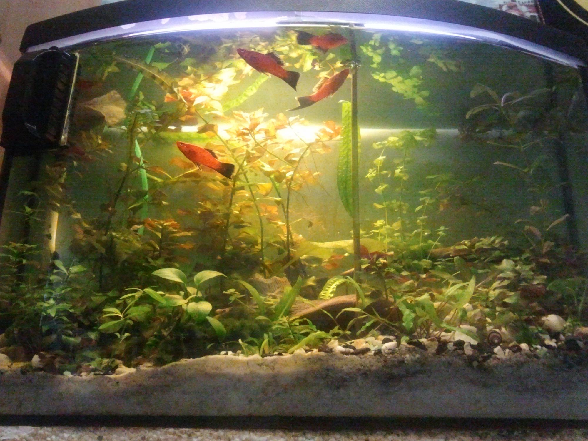 Все неплохо(ну про свет и т.п.повторятся не буду)смущает качество воды,какая-то мутноватая,да и подборка рыбок,я считаю что в таком травничке гораздо веселей смотрелась бы стайка неонов(красных,черных)чем меченосцы. Ну опять-таки это мое мнение,без обид-))