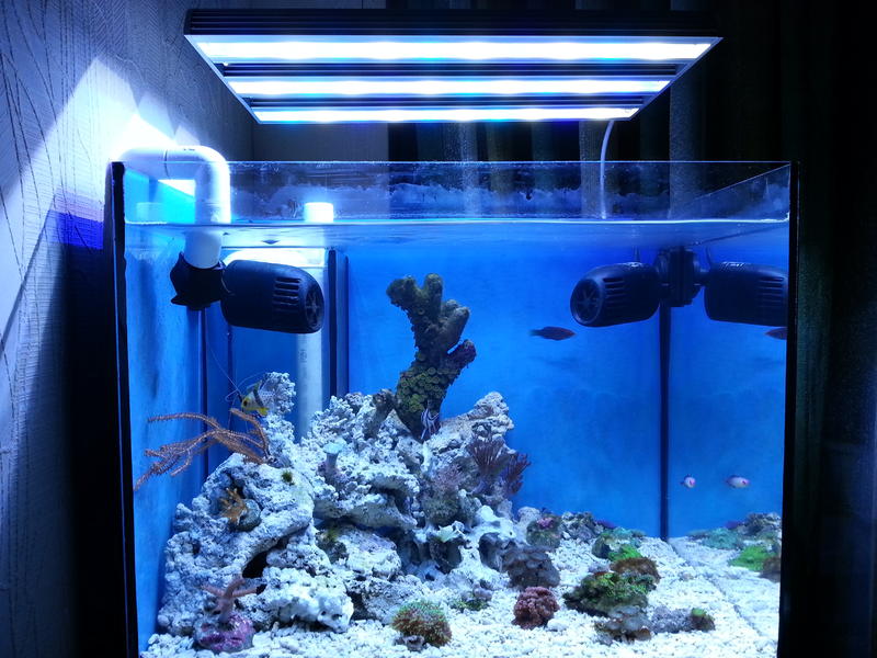 Прошло 5 месяцев. Завал полный. Начну по порядку. Справедливости ради скажу, что бластомуса выпустила 3 новых полипа, появилось несколько новых дискосом и юма разделилась на 3 части. Остальные кораллы или погибли или находятся в плачевном состоянии. СПСы посаженные в акву практически сразу начинали облетать снизу. Купленная актиния квадриколор не долго думая, уменьшилась до размеров пуговицы и в таком состоянии находится несколько месяцев, что не мешает ей принимать пищу в виде кусочков кальмара ( на фото на задней стенке можно ее увидеть). Короче денег потраченных на погибшие кораллы хватило бы на новый светодиодный светильник. Так-же практически сразу полезла нитка. Полезла так, что весь аквариум похож на сплошной зеленый ковер. Пытался пропалывать. Бесполезно. Через неделю все становилось как прежде. С таким трудом клееная конструкция из жк и казавшаяся очень симпатичной в плане дизайна, оказалась совершенно непригодной для нормальной жизни кораллов, т.к. создавала много затененных участков, а места для посадки практически не было. Было решено принять меры для изменения ситуации, но с учетом сильно урезанной статьи бюджета предусмотренной для аквы. Вода осмос + колба с ионообменной смолой. Ежедневная подмена 1 литр + 0,5 литра долив. В заднем так называемом сампе, в первом отсеке хетаморфа, во втором уголь и пенник ресан 300, в третьем губка и возвратная помпа. Конструкция из жк была разобрана. После всех изменений визуально состояние аквы осталось прежним. Последнюю неделю свет включаю на 1 час. Надеюсь нитка начнет отступать. Склоняюсь к постройке сампа, но прежде планирую посетить Донецких моряков по приглашению Андреея-TakedaMaru, чтобы воспользоваться их опытом. С Олегом-Дейви Джонс уже познакомился. Размеры будущего сампа с учетом размеров тумбы 34х38см, причем 38 ширина до задней стенки, высота возможна до 50см. В акве стенку сампа уберу. С видом слива еще не определился. Буду рад любому совету по устройству сампа и переливу. Как только появиться возможность закажу светодиодный светильник у Spam4eg. Ожидая вопрос о показателях воды отвечу: тестов нет. Пару месяцев назад просил Макса сделать тест воды. Серьезных отклонений замечено не было. Качество фото плохое. Одно со вспышкой, второе без.