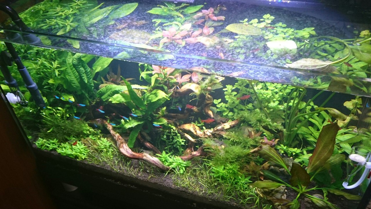 Быстрорастущие были, немного позже, я с ними не фотографировал. А сейчас убрал - заменил на другие. А насчет водорослей - я бы скорее сказал, что их нет, чем они есть. Пару пучков вэтнамки, на листьях папоротников, по сравнению, с полностью покрытыми ГДА и пушком всего аквариума, я считаю, ничего страшного. А именно так все заканчивалось все у меня. По крайней мере, я добился того, что мох у меня растет (я его два раза, уже стриг), а не чернеет и сгнивает, потом в унитаз. Стаурогин - ползет, а не осыпал листья и покрылся бородой. Красные - растения красные, а не блекло зеленые. Для меня меня это, хоть не большой успех, но успех)))) А главное, зеленкой не покрылся весь аквариум)))