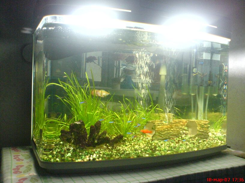 Автоматический терморегулятор на 24 градуса, вода фильтрами постоянно перемешивается. Вода в аквариуме чистая и прозрачная. Рыбок на 65 литров - было 12 маленьких неонок, пара лялиусов, пара сомиков, три меченосца. Вроде как по всем подсчетам перенаселение не грозит. Рыбки вроде так подобраны что не должны друг другу мешать. Кормлю один раз в день.