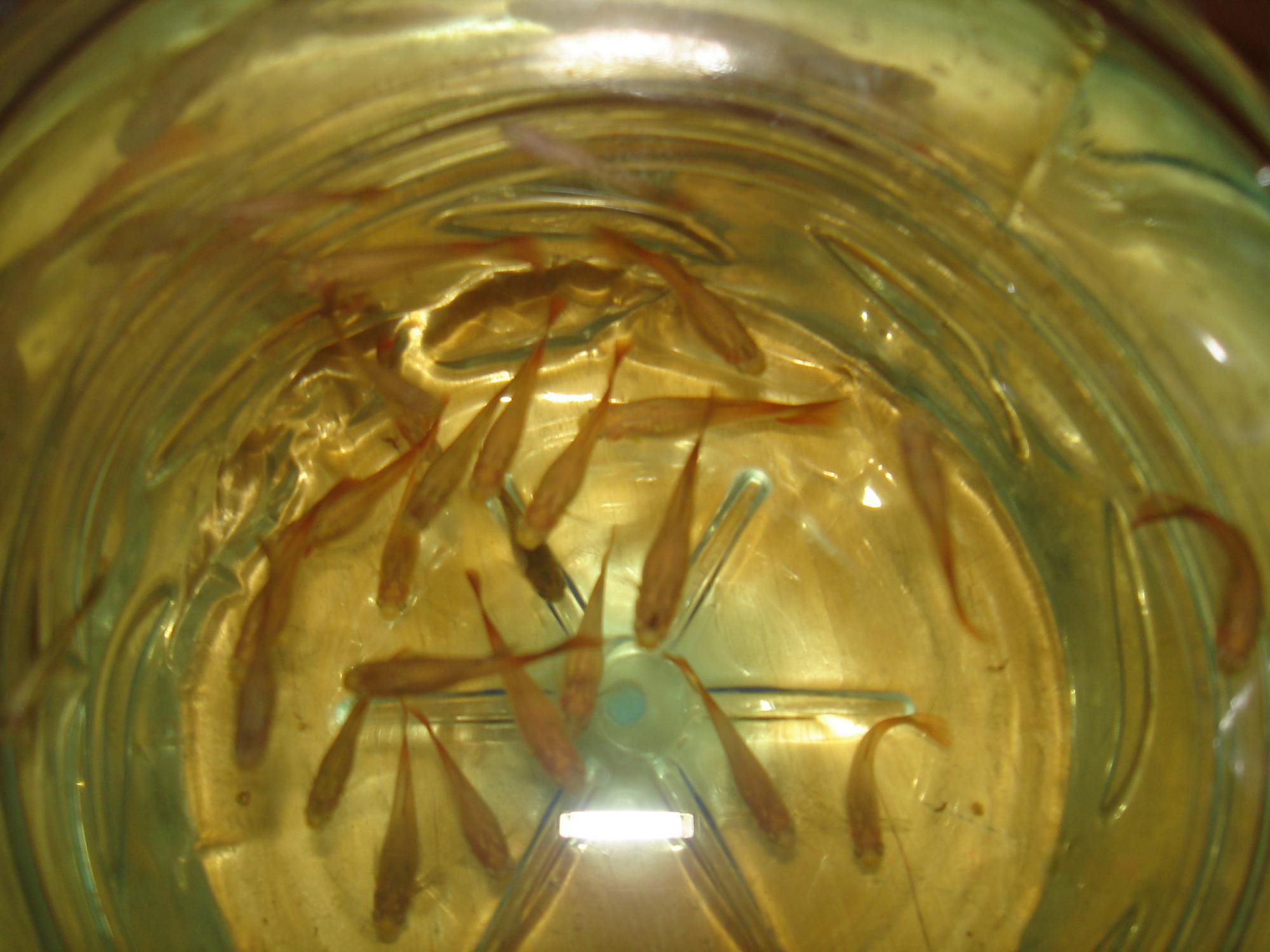 подросли ще гупики (золотистые с красноватыми хвостиками)