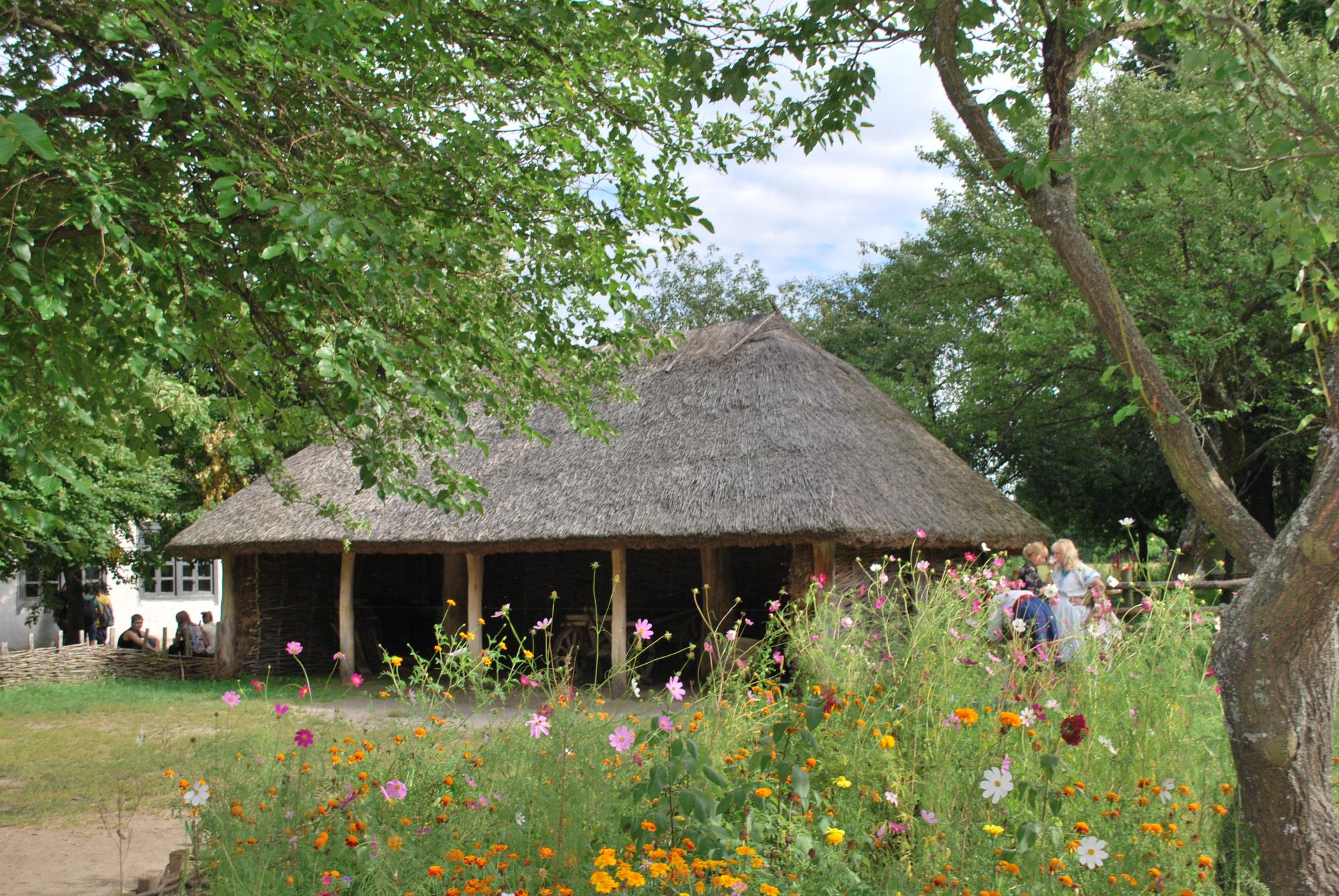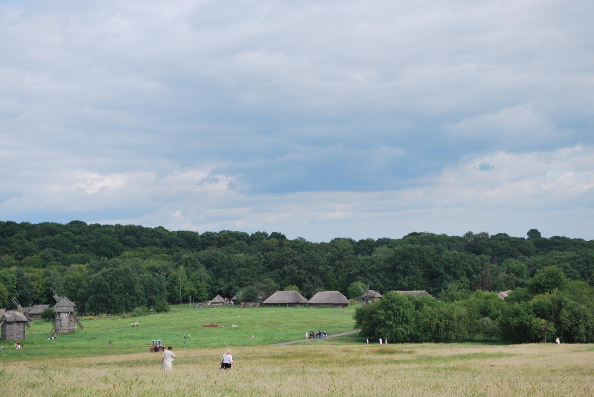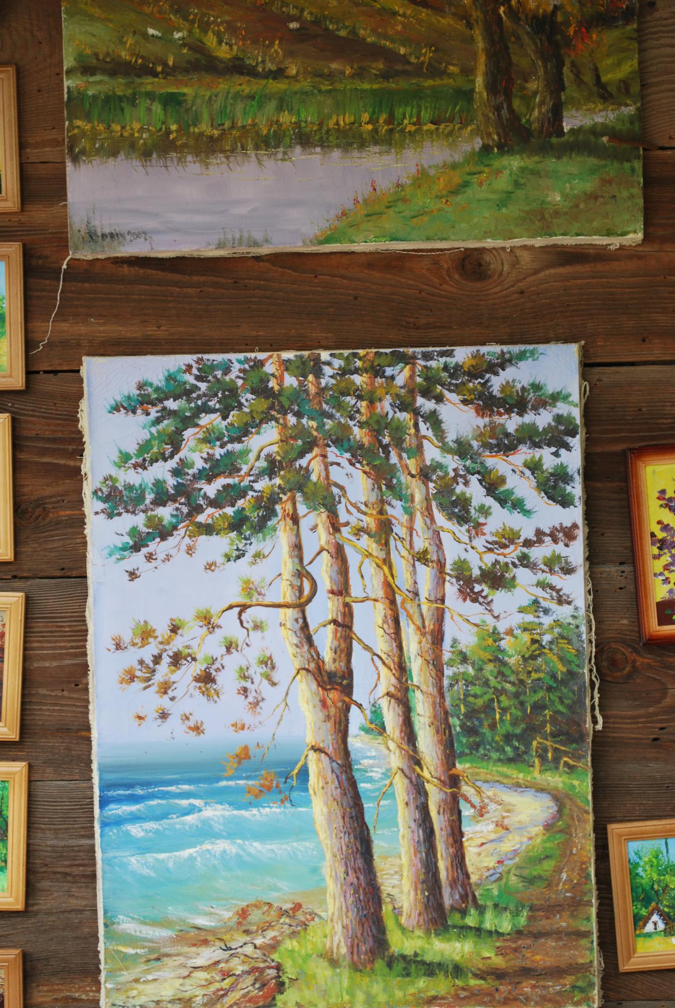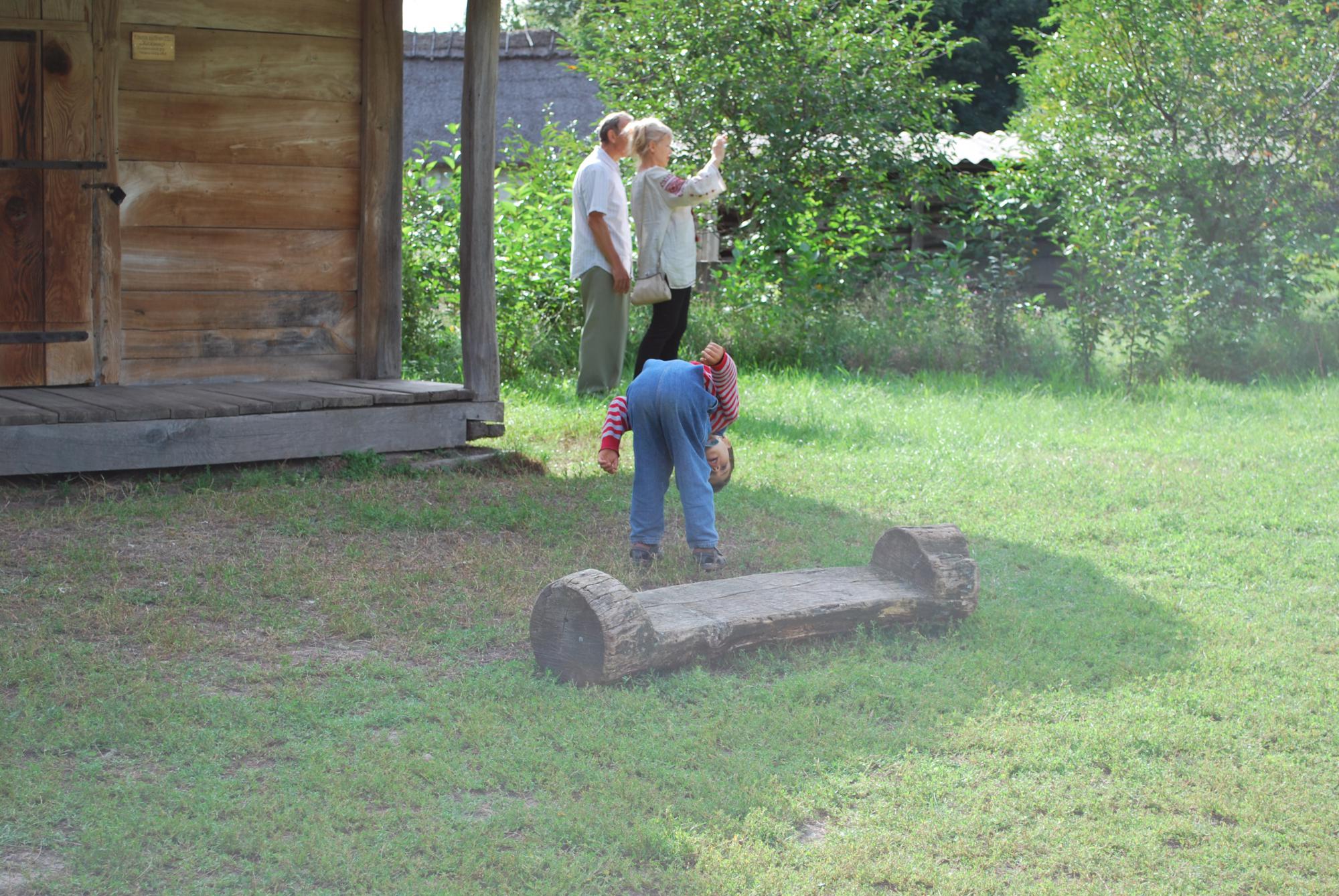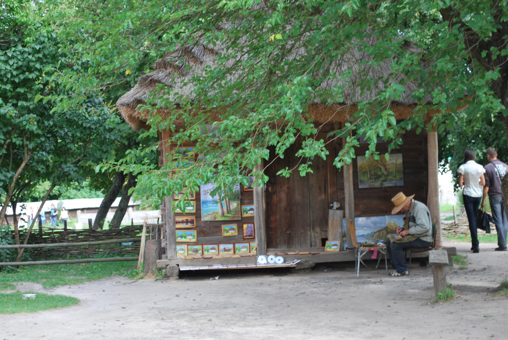 помимо все время действующей экспозиции народной архитектуры и быта нам повезло в одном из двориков Подолья наткнуться на мастера живописи. довольно пожилой человек в соломенном брыле слушал козацкий хор и рисовал новую картину. Он оказался очень приятным и я бы даже сказала лучезарным и добродушным старичком с сатирическим чувством юмора ( он так же является автором книжки сатирического юмора "Горохом по спині", в книжке очень много забавных карикатурок на русском языке)