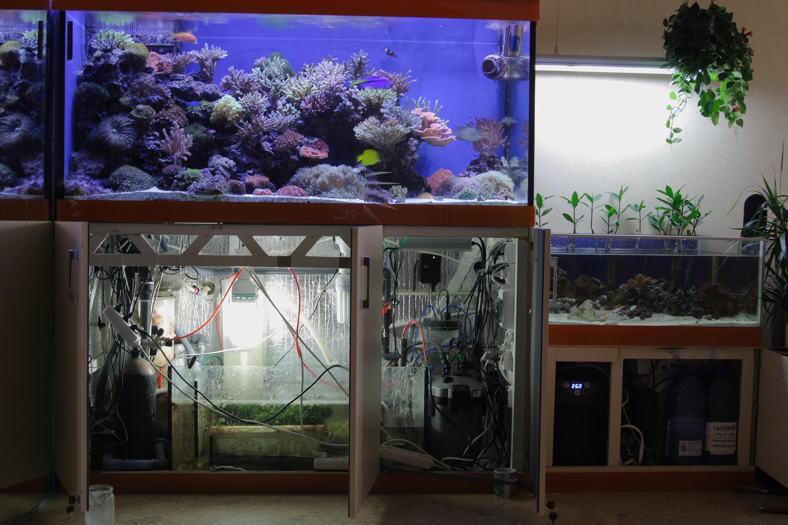 Пенник, стоит сразу после слива и сам воду сбрасывает в самп. Воздух берет с улицы через дыру в стене. Справа на фото - мангрятник, под ним в тумбе холодильник и бесперебойник с аккумуляторами, который питает помпы течения и возвратную помпу Ехейм 1262 по-моему (та, что на 3,7 тн./час.). Так-же там стоят баклаги с баллинг-растворами, т.к. кальц реактор Риф-Октопус не успевает за апетитами акропор. В сампе наконец-то начала расти хетаморфа и там-же стоит мешалка кальквассера производства Андрея Ткача, в которую, через трубочку с кухни подается подготовленная вода. Подача регулируется контроллером автодолива, датчики которого расположены в возвратном отсеке сампа.