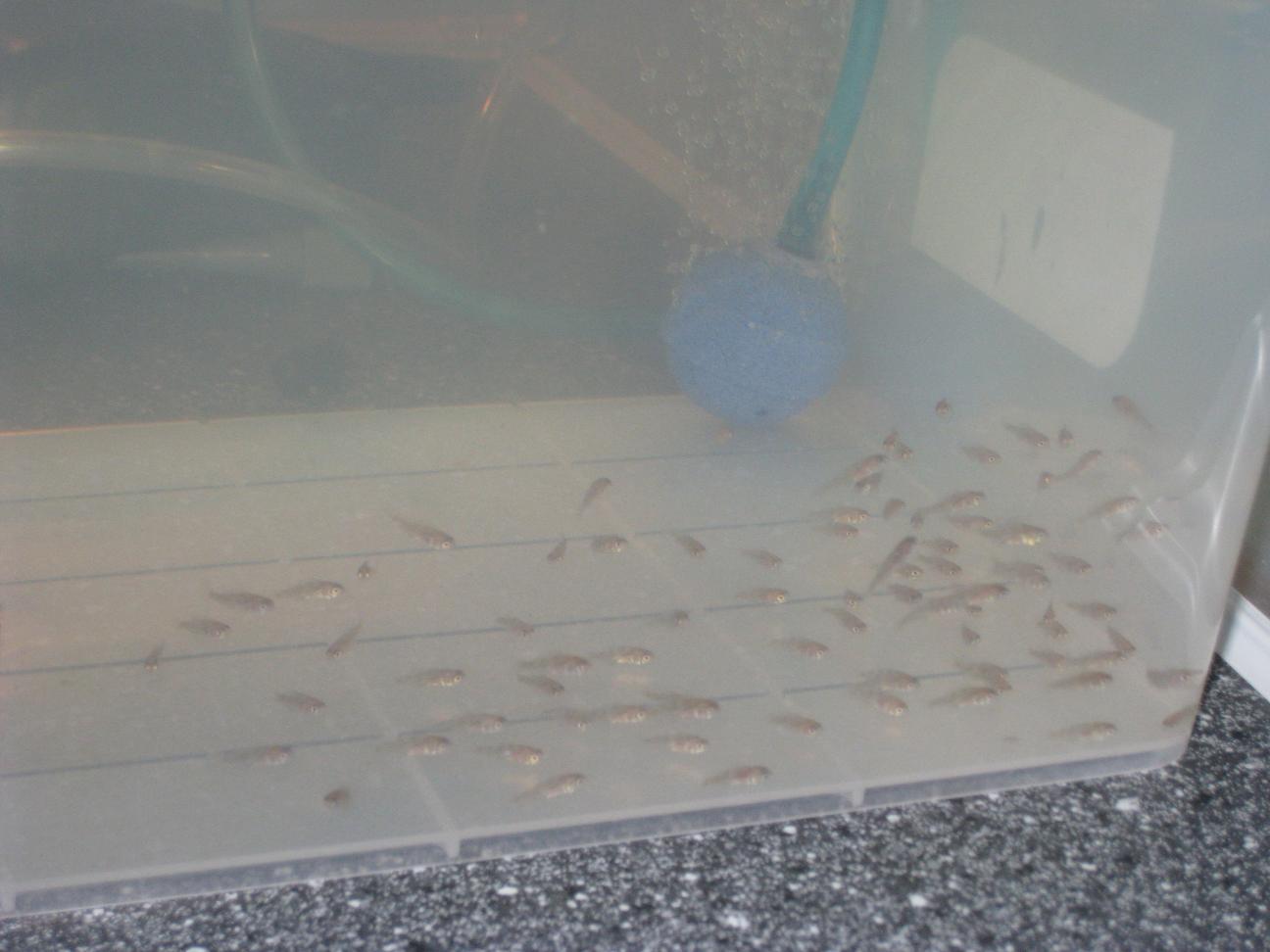 В процессе выхаживания малька от Фаи, произошёл акт икрометания у Мурки (одноглазой) - это её первый нерест. Делал всё как в вышеизложенном случае. Малёк прожил сутки (34 штуки), те же условия, вода, температура, воздух. Непонятно, утром встал покормить малька, все были живы - кинул корма (причём корм, так сказать из одной миски для всех) отвернулся по делам и в течении часа весь малёк слёг, жалко. Всё это произошло без подмены воды, аэрация не останавливалась, температура не менялась, одно объяснение - первый нерест у самки и малёк слабый.