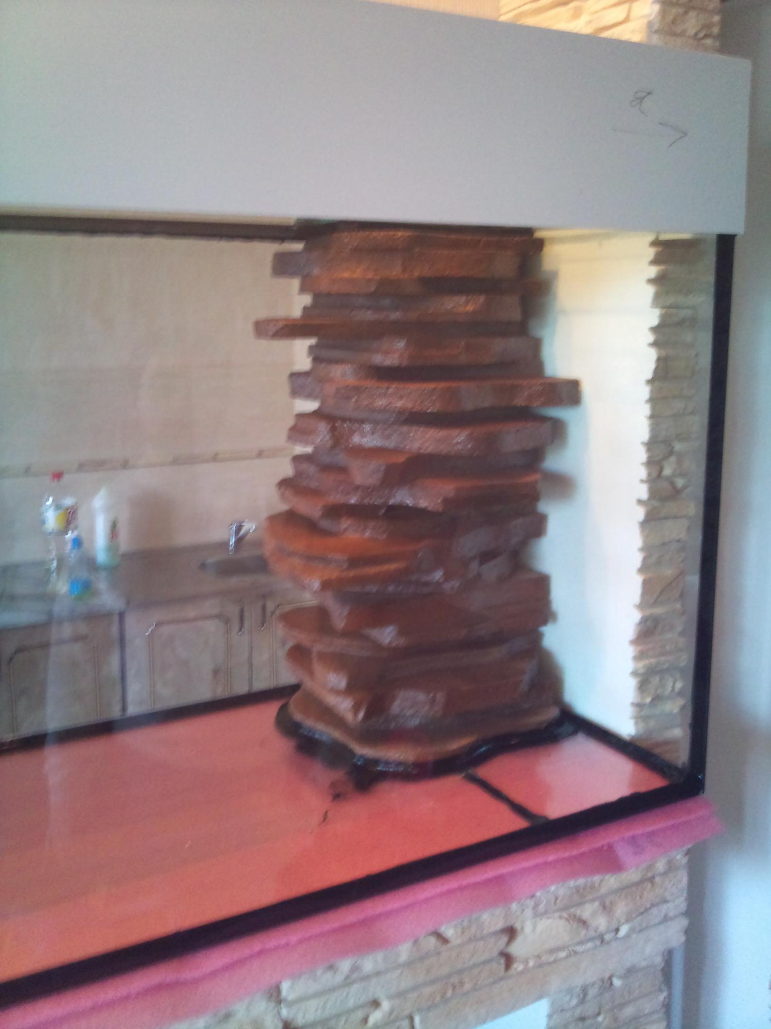 Решение- почитав форум и полазив в интернете пришёл к выводу что надо делать раствор из цемента либо плиточного клея.я выбрал вариант 1 так как не хотел особо заморачиваться.Сделав макет необходимого мне фона и приготовив раствор из цемента и ПВА(для прочности) я начал покрывать фон раствором в 3 слоя.Получив то что получилось, подождал 2 суток что бы то высох и скрепился.Убедившись что раствор твёрдый решил перейти к этапу покраски данного девайса.После высыхания краски(автомобильная в болончиках) было решено перейти к пробному эксперементу.Наполнив ванну водой я погрузил фон в воду и прижал с обратной стороны гантелями(что бы тот не всплыл).Результата погружения в фото отчёте нет, но результат к которому привело это погружение на лицо.раствор вместе с краской начал отваливаться кусочками в некоторых местах.было решено удалять весь декор с полистирола и искать другой метод.Возможно я что то делал не так и где то не соблюдал какую то технологию, но факт остаётся фактом-всё отвалилось.