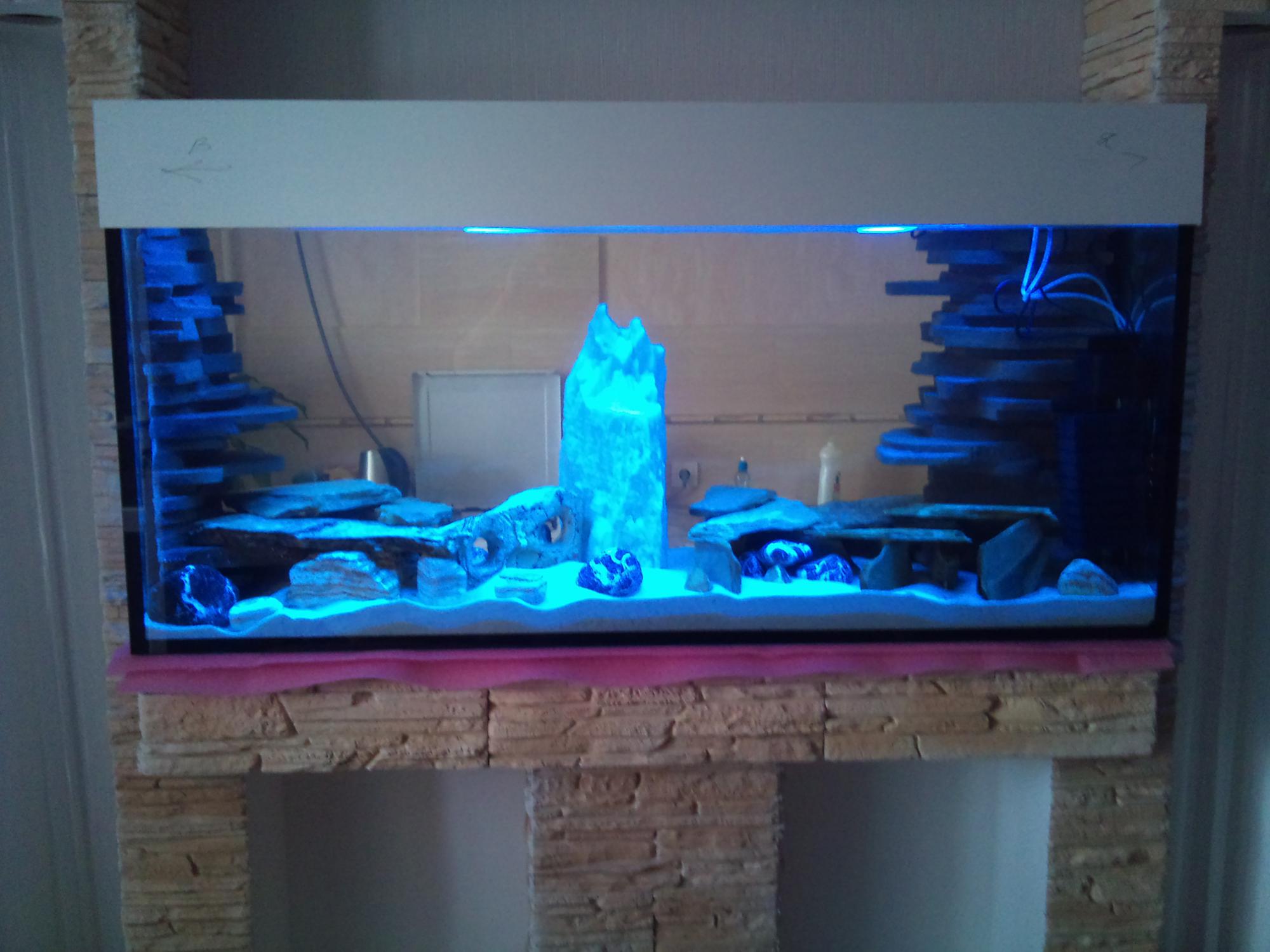 После удаления практически всего раствора,удалить весь небыло возможности т.к есть трудно доступные места(приходилось прибегать к услугам зубной щётки) и начал искать другое решение.Походив по строй магазину набрёл на спеиальную грунтовку для пенопласта, которая делает материал более ширшавый и при нанесении на него какого либо раствора сцепкость более надёжная.Решив больше не повторять эксперименты с раствором начал искать другой выход и набрёл на такую вещь как гидроизоляционный материал.Продаётся в ведёрках, густая смесь при застывании приобретает текстуру и свойства резины.Было решено приобретать и пробовать.Покрыв ранее побывавший в эксперементах полистирол грунтовкой(она к стати содержит мелкий кварцевый песок и придаёт ещё более естественную текстуру декору),дождавшись когда это высохнет я перешёл к этапу нанесения гидроизоляции.Грунтовка розового цвета, а гидроизоляция белого.Затем приступил к покраске.И получил то что вы видете на фото.Установка в аквариум как обычно на силикон.После установки фона в аквариум прошёл месяц, результат пока не огорчает.
