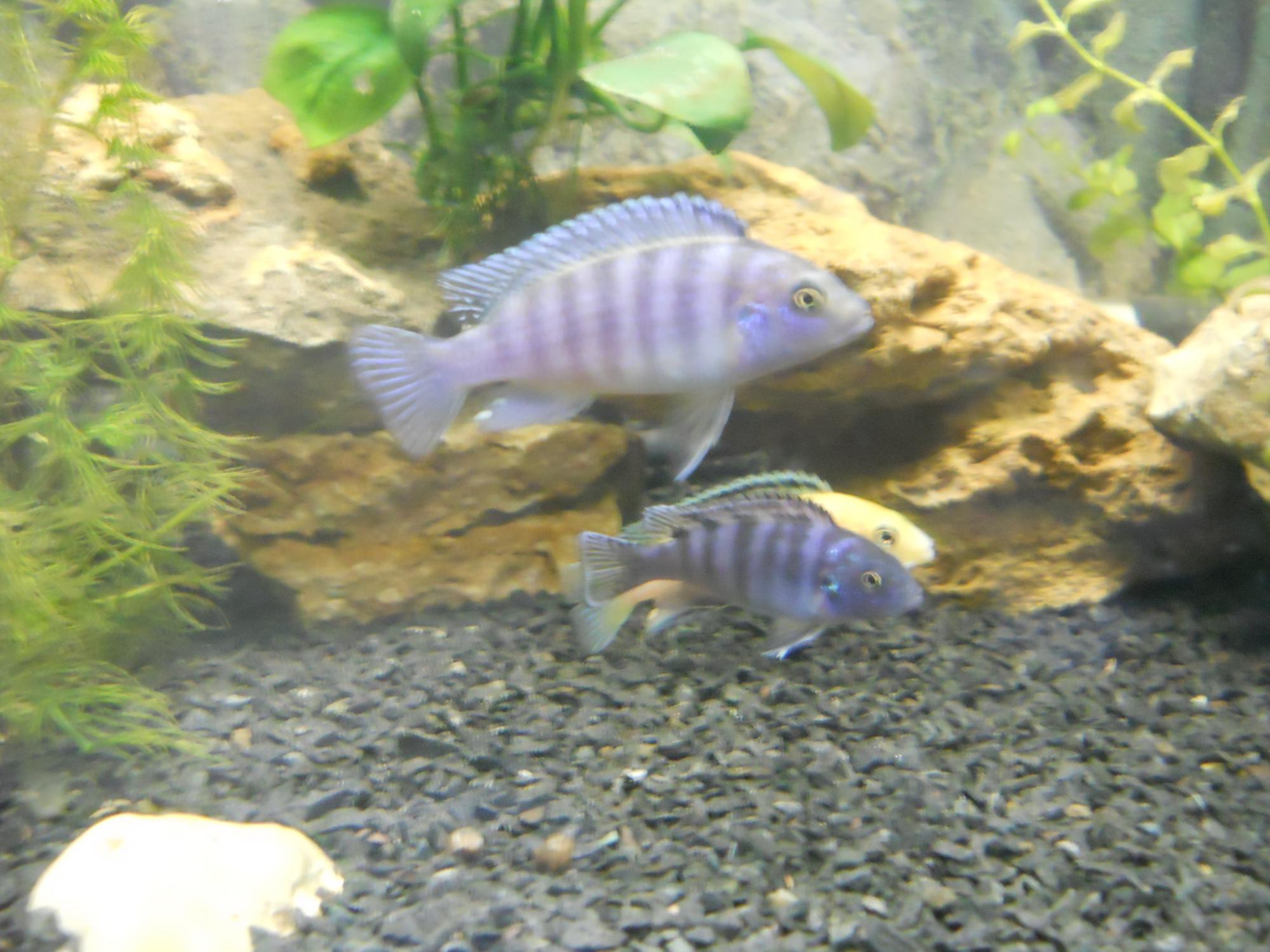 На первом фото с лева на право - это Малавийские Цихлиды, самец (жёлтого цвета) и самка (синяя в полоску)- Псевдотрофеус Ломбардо (Pseudotropheus lombardoi)