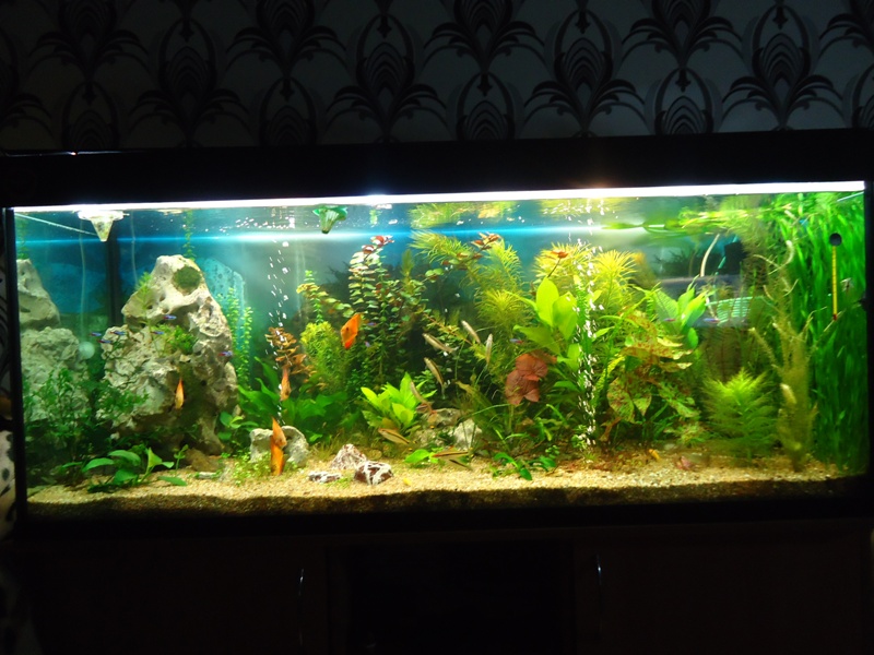 Первый аквариум 450л. 150х50х60. Освещение 2 лампы АкваГло и 8 экономок разного спектра. Турбо фильтр на 500л. Подача СО2. Дропчекер.