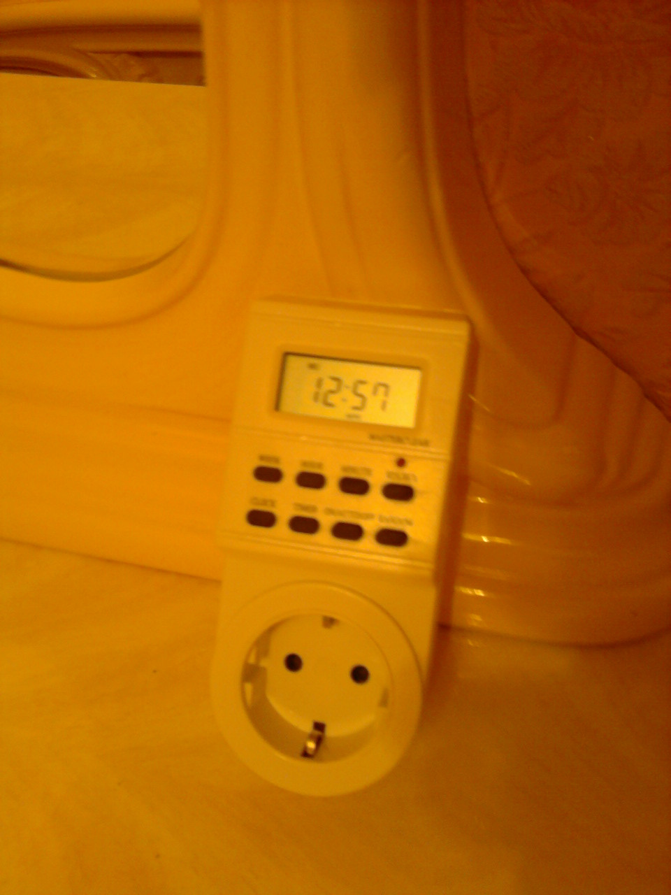 К нему подключены три лампы по 8Вт через тройник, которые работают в режиме: вкл утром - выкл днем - вкл днем - выкл вечером.