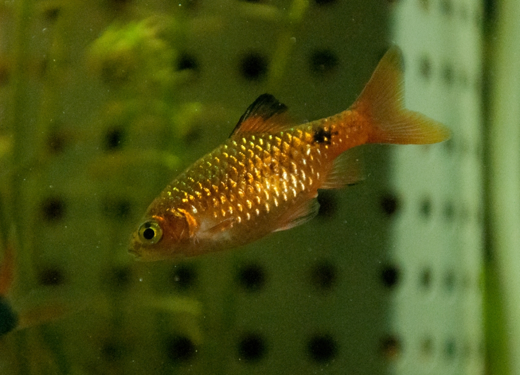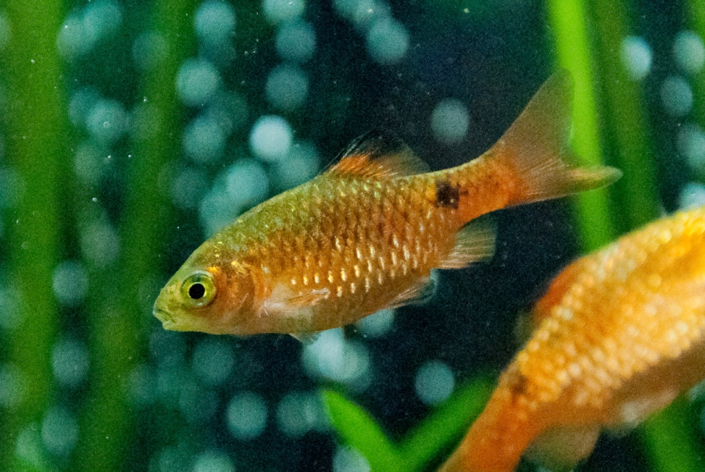 У первого барбуса на спинке появилось пятнышко без нескольких чешуек, остальные его покусывали и я его отсадил, сегодня заметил у второго похожий симптом только на левом грудном плавничке. Плавничок похож на обгрызенный и он им практически не работает.