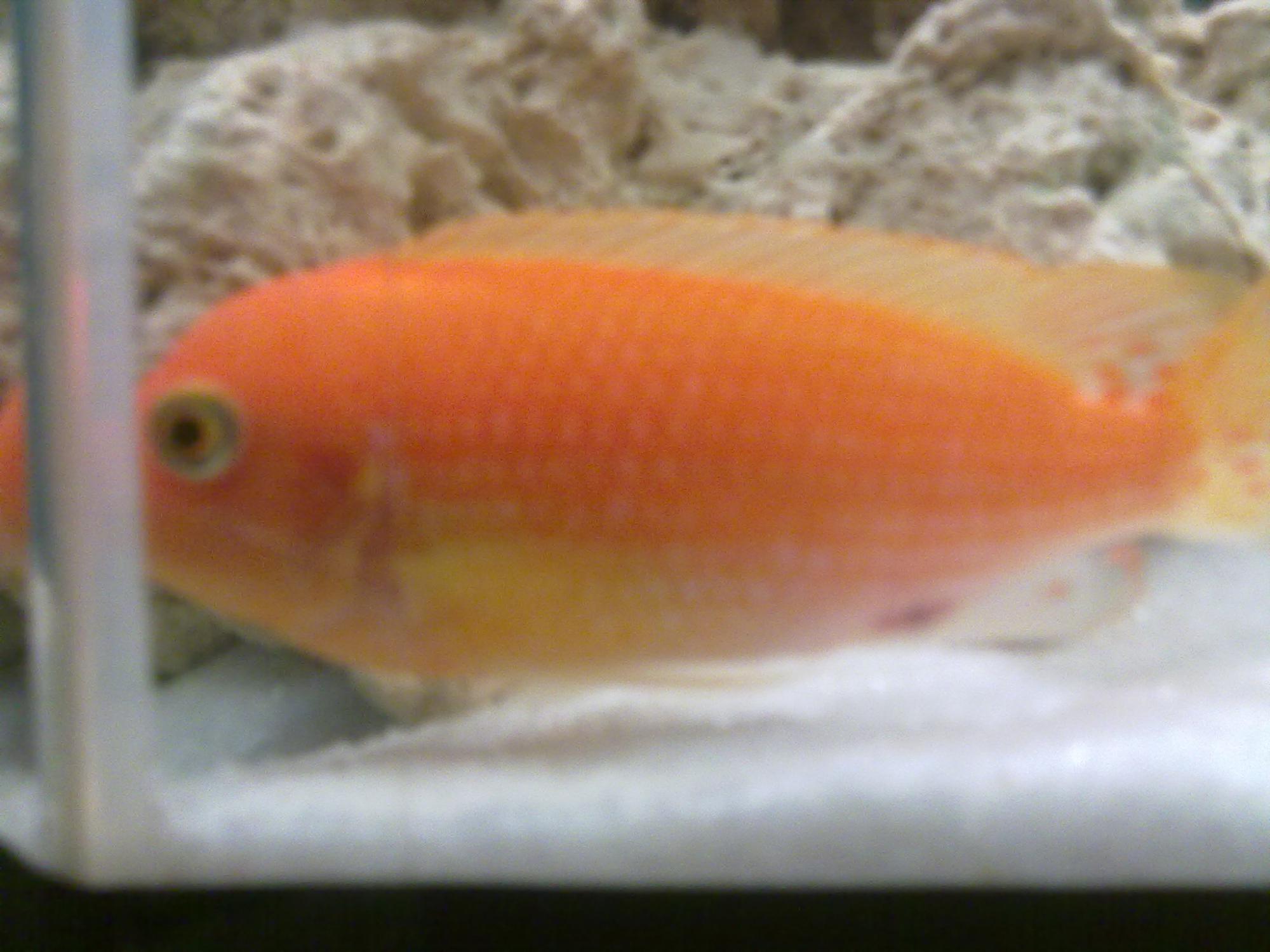 Доброго времени суток. помогите советом добрые люди. Заболела малави ред-ред зебра. после добавления в аквариум самки через 3-е суток появилось пучеглазие у самца, и покраснение (больше похоже на подкожную гематому) на теле в области анального плавника. стал адинамичен, держится у грунта, корм не принимает.