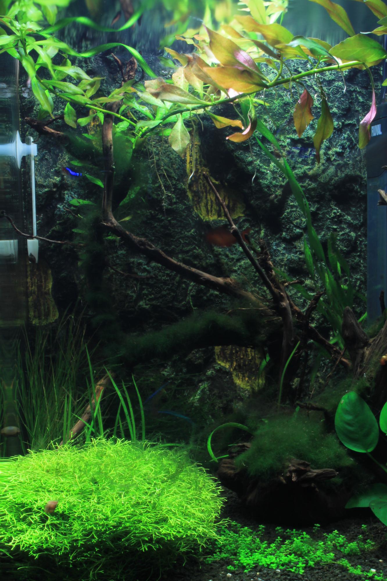 Всем Доброго времени суток и с Новым Годом!Выкладываю на ваш розсуд свой первый нано аквариум Fluval Flora 30 литров.Запущен приблизительно полтора месяца назад.Грунт мелкий гравий.Подложка Sera floredepot.свет Fluval Fluorescent Light 11 ватт,который шел в наборе.Фильтр родной.Водичка радует своей прозрачностью.Изначально была идея запустить креветок,но подумал что я ничего в этом не тямлю и запустил 7 неонов ,позже для борьбы с пленкой на поверхности воды 2 гупешки.На сегодняшний день расстения растут хорошо,единственное,что мало радует,так это Куба,которая тянется к верху,но никак не хочет разрастаться ковриком.Я так понимаю мало света.Коряжки купил,но совершенствовал сам.Буду рад любому совету и мнению